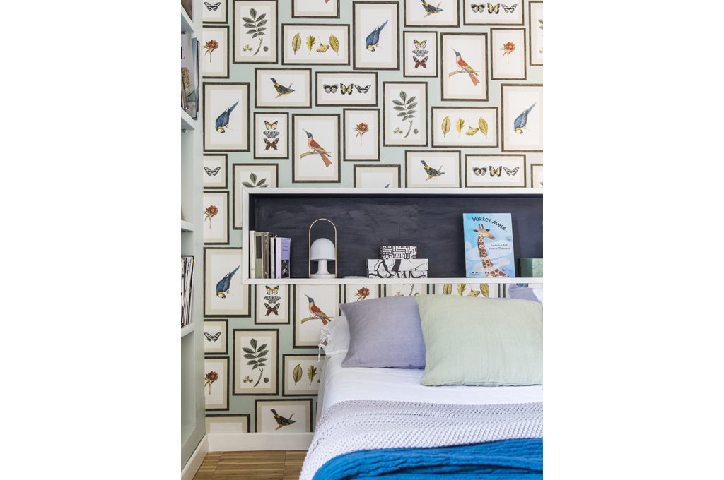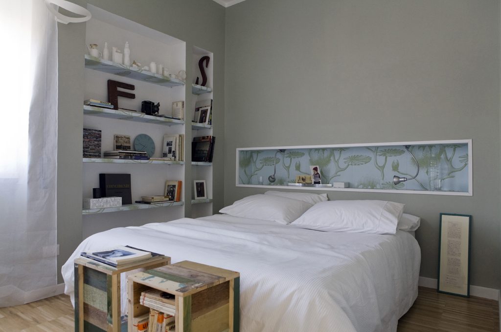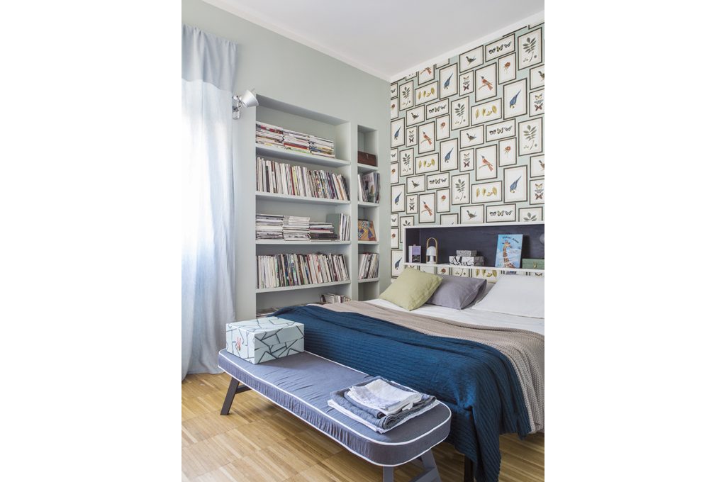Dietro il letto è stata posata la carta da parati Picture Gallery Aqua [Sanderson €119 il rollo da m 10x68,6 cm]. Lampada nella nicchia [da Magazzini Associati].