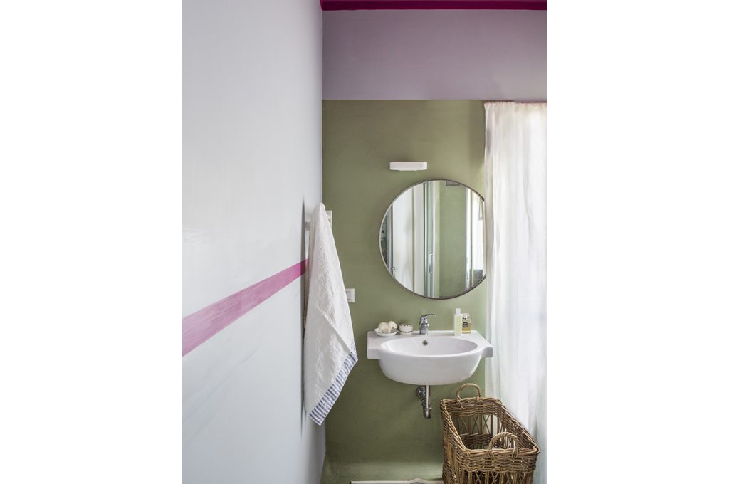 Il secondo bagno è micro perciò ha al posto delle piastrelle è stata data una pittura a smalto lavabile bianca su una parete e verde salvia sulle altre; rosa per il soffitto