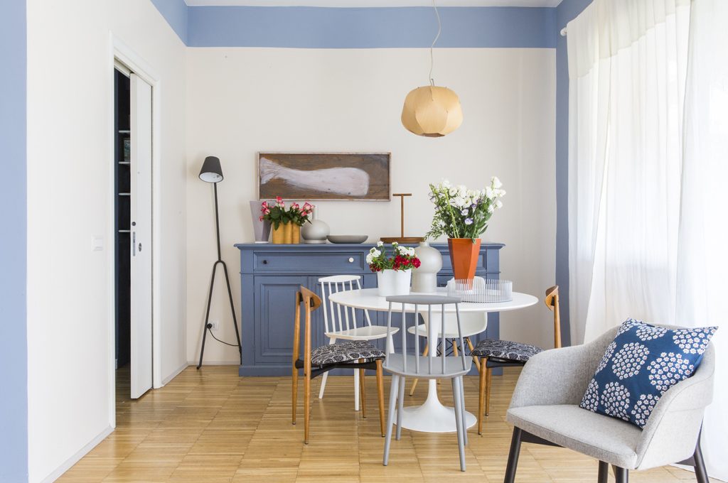 Sul lato opposto, il pranzo con tavolo tondo e credenza nel tono leit motiv (ma le pareti bianche sono solo incorniciate d'azzurro per non 'restringere' il locale)