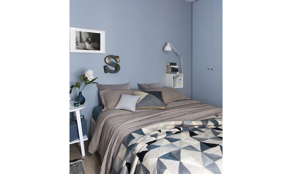 La camera non è grandissima, quindi per renderla visivamente più ampia ma, allo stesso tempo, intima, pareti e armadio sono stati dipinti in un unico colore, l'azzurro polvere chiaro. Qui Vanessa ha proposto un mood nordico che caratterizza mobili, complementi e tessuti: semplici ed eleganti in tinta unita o fantasie geometriche in bianco, grigio e blu.