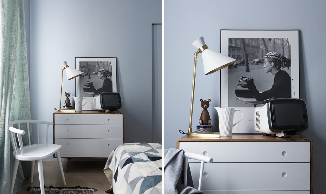 Sulla cassettiera Marlen [Novità Home, cm 88x45x78h €863], lampada Peggy [Gong], brocca [Zara Home €19,99], tv Algol [Brionvega €975], orsetto Mama Bear, scatola Matee [Lucie Kaas] e foto Anni ’60 [L’Affiche]. Sedia W.605 [Billiani €253].