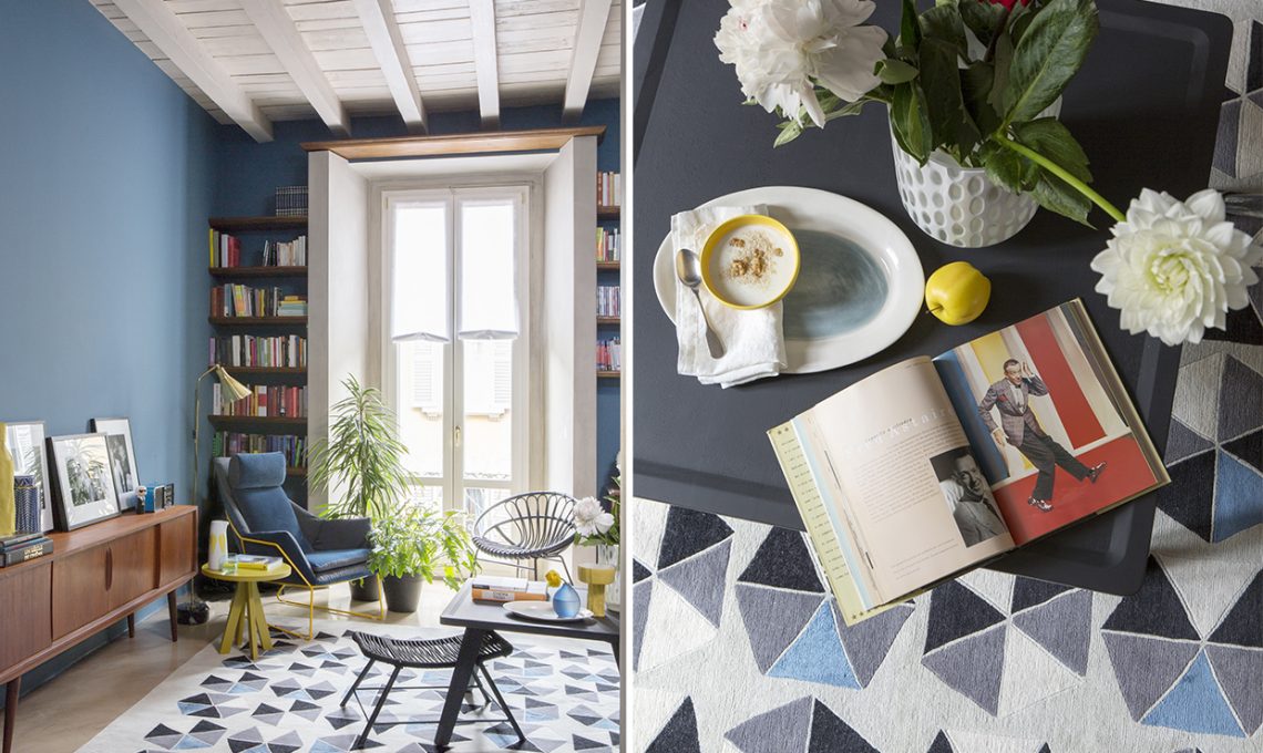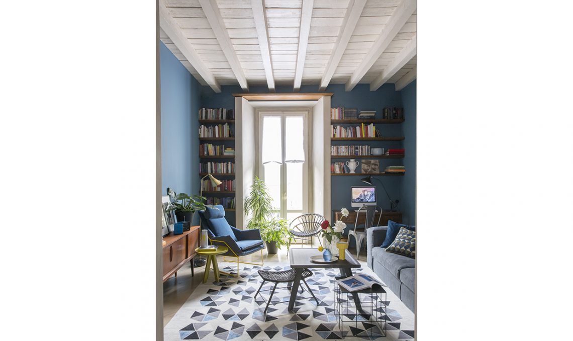 Il soggiorno racconta un’altra storia rispetto a quella della cucina. Là c’è la vita da condividere con gli amici, qui Vanessa ha ricavato un ambiente che avvolgesse Sophie nei momenti di relax durante i quali ama vedere film (la sua è vera passione) e leggere libri. Ha scelto un tono riposante di blu, colore preferito di Sophie, per le pareti, poi ripreso dalla poltrona da lettura, dai cuscini, dal tappeto con decoro geometrico disegnato da Gio Ponti. Proprio il mood del tappeto ha suggerito di rivestire il divano in lino antracite. Per dare risalto alla collezione di Sophie di foto dei divi del cinema (al centro spiccano Alain Delon e Brigitte Bardot), Vanessa ha creato un angolo vintage con un sideboard danese degli Anni ’50. Al centro della stanza, tavolini di colori e forme diversi per creare composizioni sempre nuove.