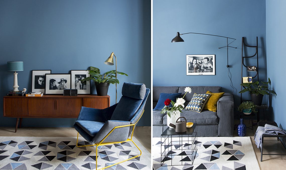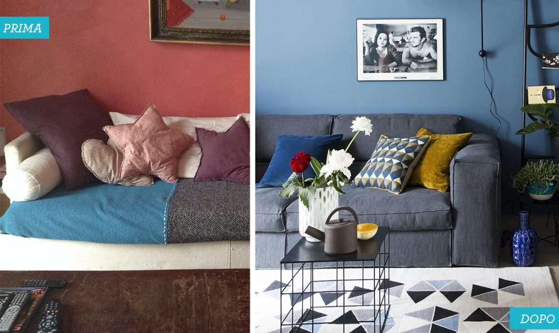 Dal rosso pompeiano...al blu/grigio chic! Qui, per le pareti, è stato usato il colore SO.20.40 Color Concept [Sikkens]. Divano Up [Saba Italia], qui con cuscino geometrico Escher [Niki Jones].