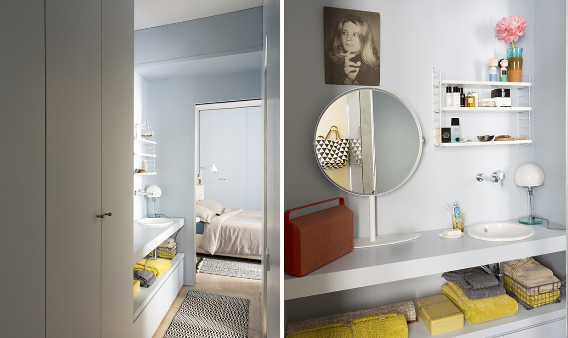 In corridoio c'è l'angolo beauty: nel mobile smaltato [Color Concept 4041 S0.05.75 di Sikkens] è inserito il lavabo Connect [Ideal Standard]; specchio Kioo [Calligaris €382], scaffale String Pocket [String, €133].