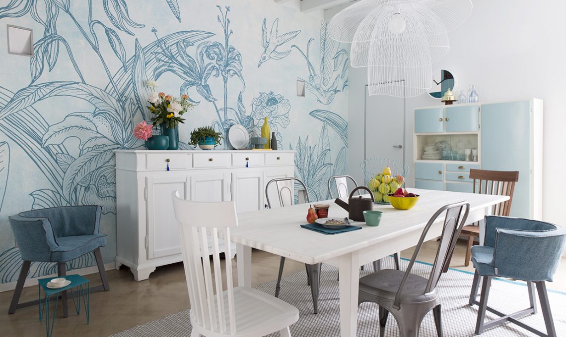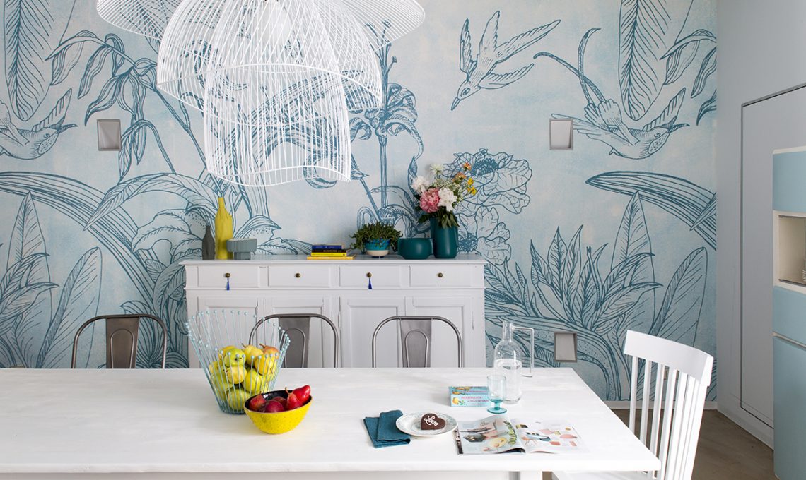 Tappezzeria macro Sottobosco [Wall&Decò € 110/mq]. Mobile e tavolo di legno erano scuri e sono stati ridipinti in bianco. Sedie: in metallo Xilo Baru [Novità Home €148]; imbottite Gray 26 [Gervasoni €597]. Credenza stile Anni ’50 [Spring_lab]