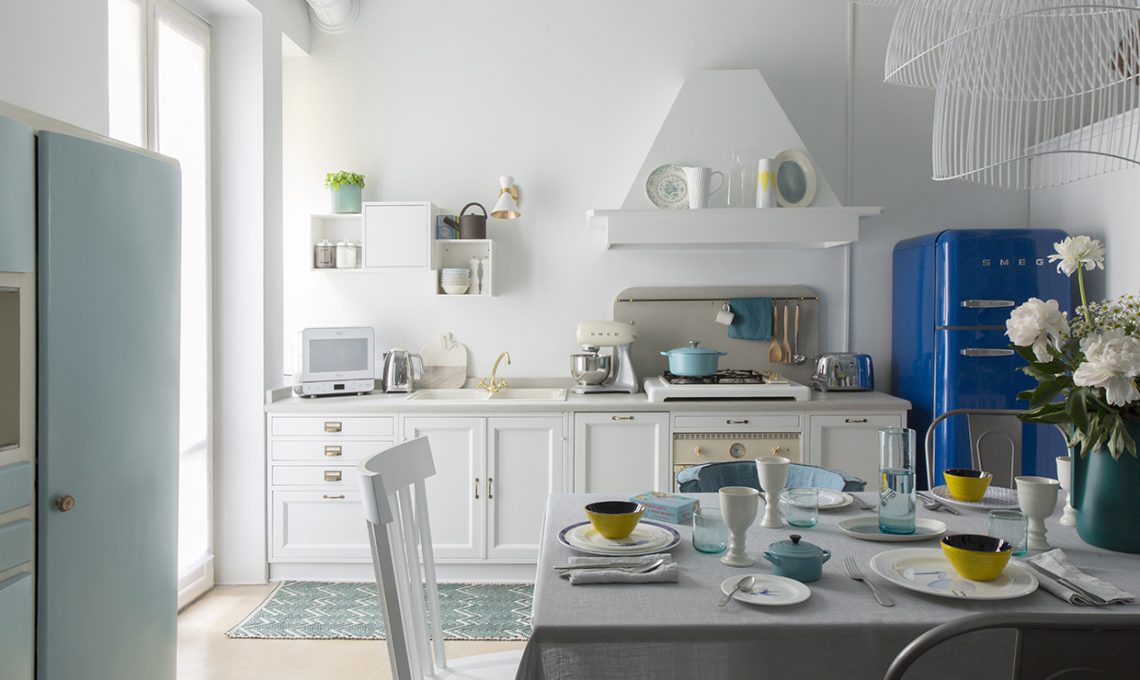 L'incantevole trilocale, rinnovato in azzurro e bianco, acquista luminosità e mantiene il suo fascino vintage grazie a 3 lavori fai-da-te