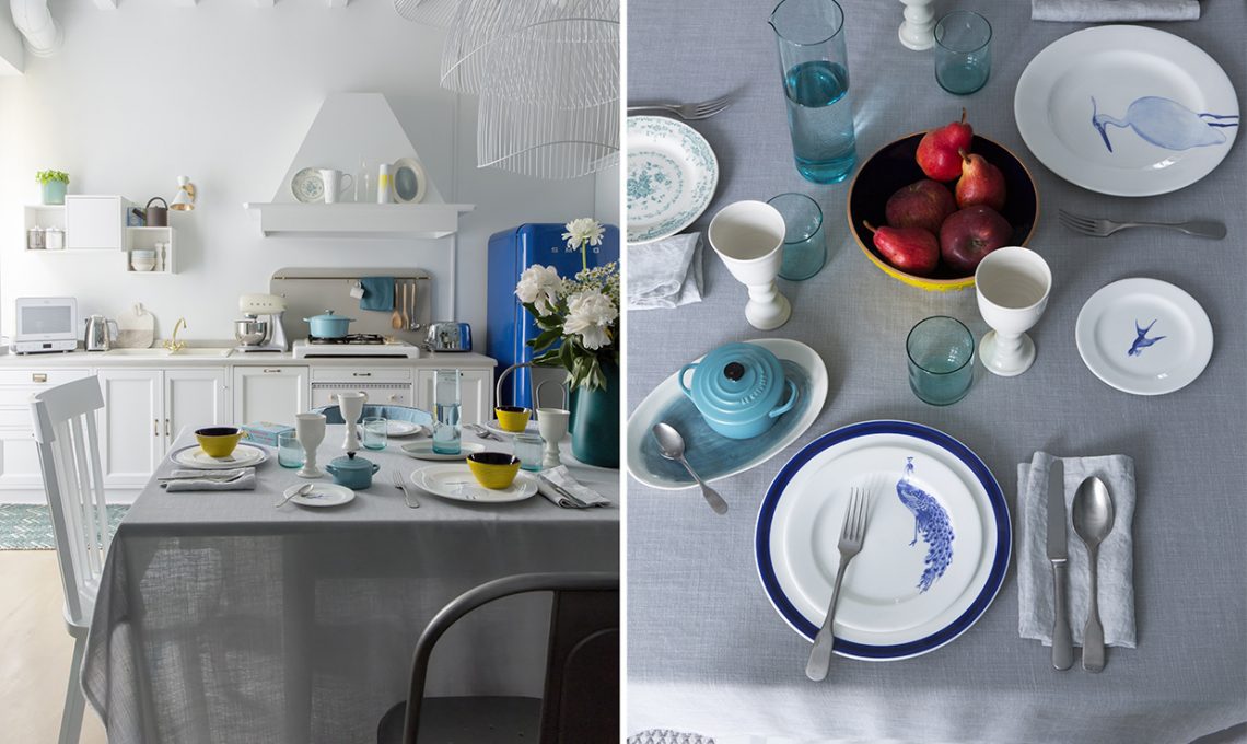 Calici bianchi [Paola Paronetto], ciotole smaltate [Bifranci da €20], mini cocotte Riviera blue [Le Creuset €22], piatti Shabby Chic [da €25] e posate Brick Lane di Kn Industrie. Bicchieri e caraffa Bloom [Bitossi Home].