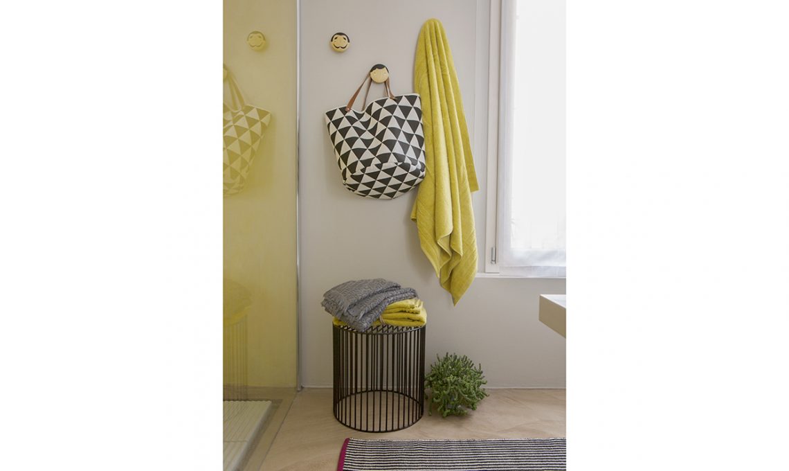 Poltrone: New York Bergère [Saba Italia €1.186] e Roxanne [Vincent Sheppard €399]. Tavolini: giallo A.ngelo [Atipico €262] e nero Gray54 [Gervasoni €954] con coppa gialla [Paola Paronetto] e piatto [Bifranci]. Sgabello in metallo e corda [Zara Home]