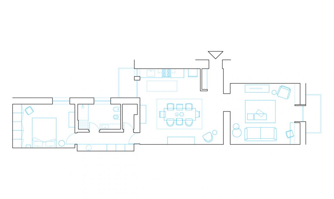 90 mq particolari: i locali sono tutti allineati. Per privacy, è stato creato il mini-ingresso nella grande cucina centrale. Alla camera si arriva dal corridoio la cui parete, di fronte al bagno, è attrezzata a zona beauty, con lavandino.