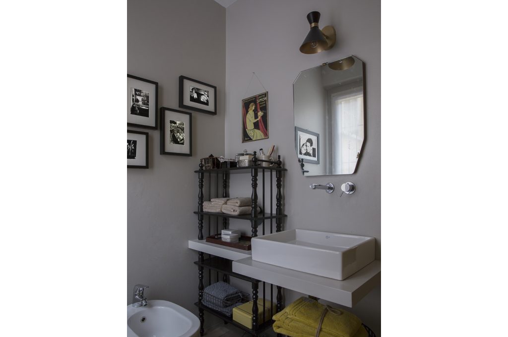 L’étagère in legno, che prima affiancava il lavandino sospeso, è stata tagliata orizzontalmente in due parti, posate una sotto e una sopra il nuovo piano in mdf, creato per ospitare il lavabo da appoggio. Con questo trucco il bagno ha un piano ampio, più pratico del piccolo lavabo di prima. E si è conservata l’étagère, dopo averla ridipinta color antracite.