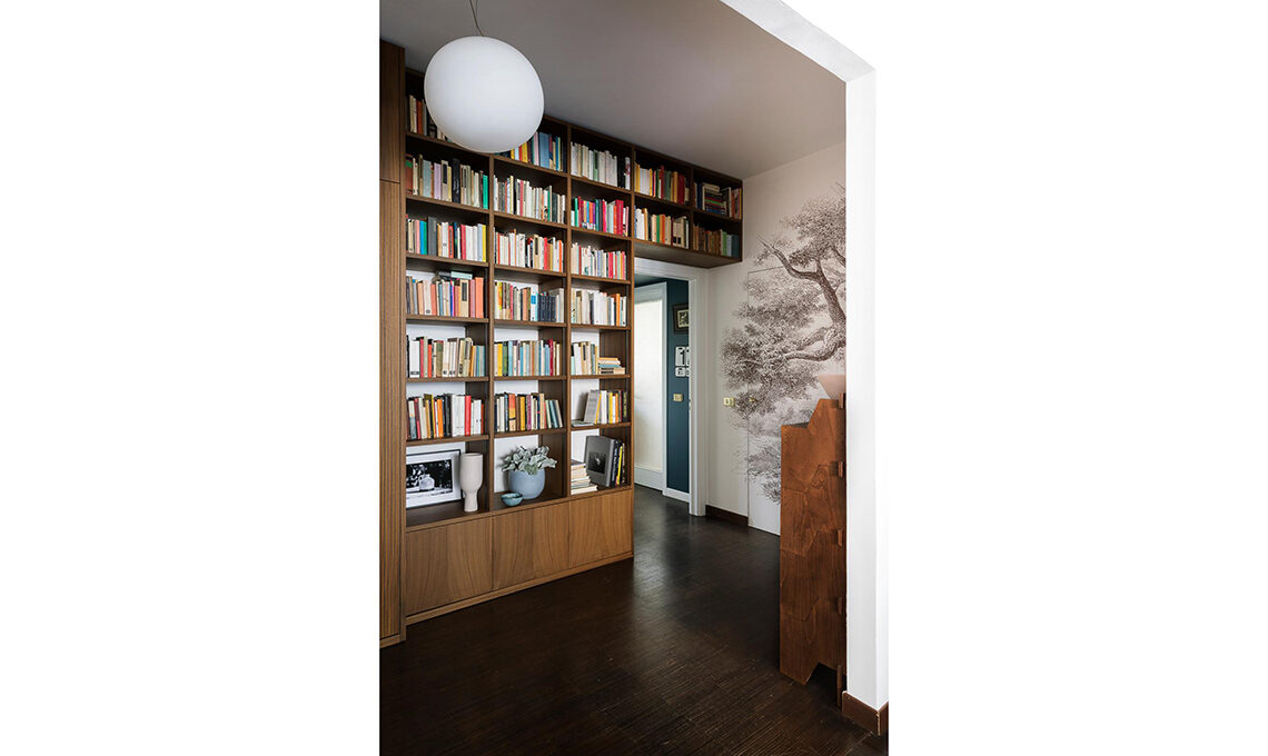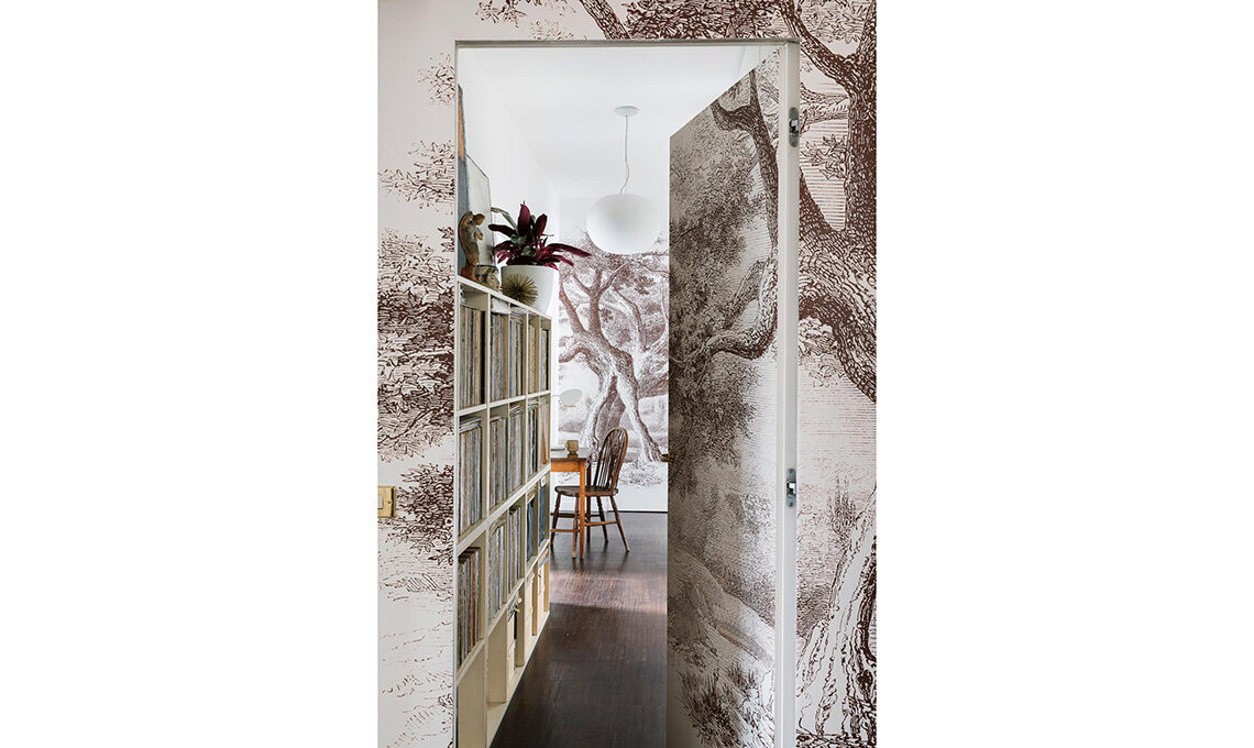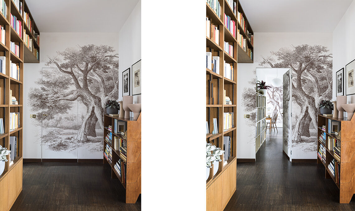 La prima cosa che si vede entrando in casa è la tappezzeria con alberi ispirata alle stampe ottocentesche. Hai notato? È ripresa sulla parete di fondo, nella porzione di corridoio al di là dell’ingresso, e crea un gioco di prospettive.