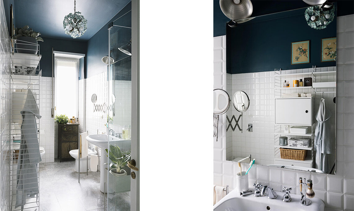 Sulla libreria modulare String in metallo bianco [String Furniture], prodotti skincare [Womo]. Il lampadario d’epoca spicca ancora di più sul fondo blu del soffitto.