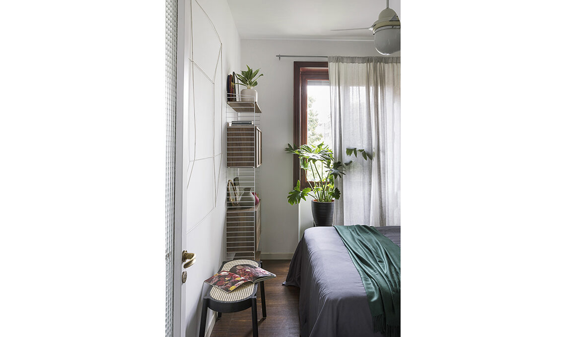 Di fronte al letto, libreria con contenitori [String Furniture], panca in legno e paglia di Vienna [Northern, cm 80x32x46h € 758 ca] e opera cubo schiacciato [Antonino Sciortino].