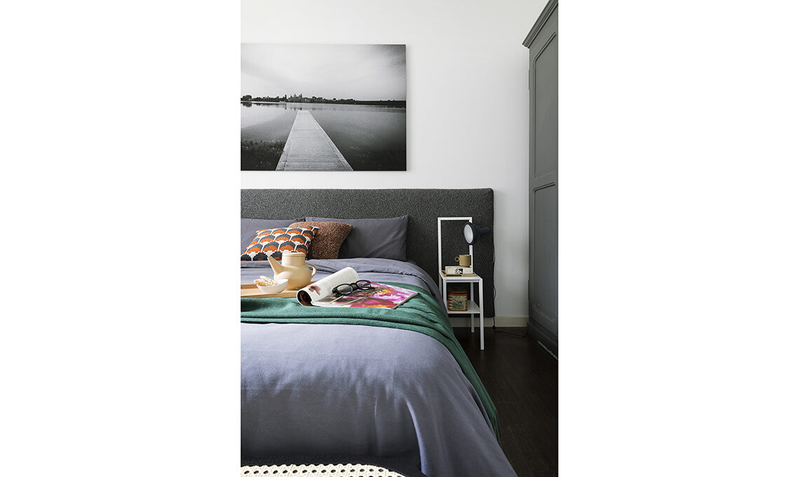 Lenzuola [Croff], plaid verde Puro [Christian Fischbacher], cuscini Ember Cushion Brick e rivestito in tessuto Arcade di [Kirkby Design] come il tessuto Terrain Graphite che riveste la testiera; sul vassoio ciotolina [Laesse] e teiera [HKliving].