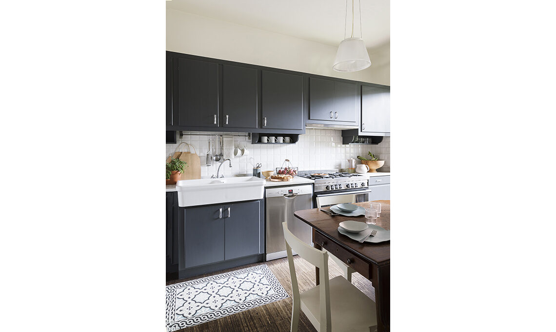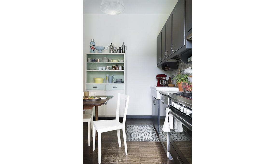 La cucina fatta su misura con linee Fifties aveva gli stessi colori, bianco e menta, della credenza originale. A contrasto, le pareti erano scure. Per svecchiare e dare più freschezza e charme, Vanessa ha proposto di dipingere i mobili con smalto antracite e di rendere bianchi i muri.