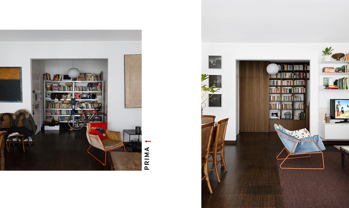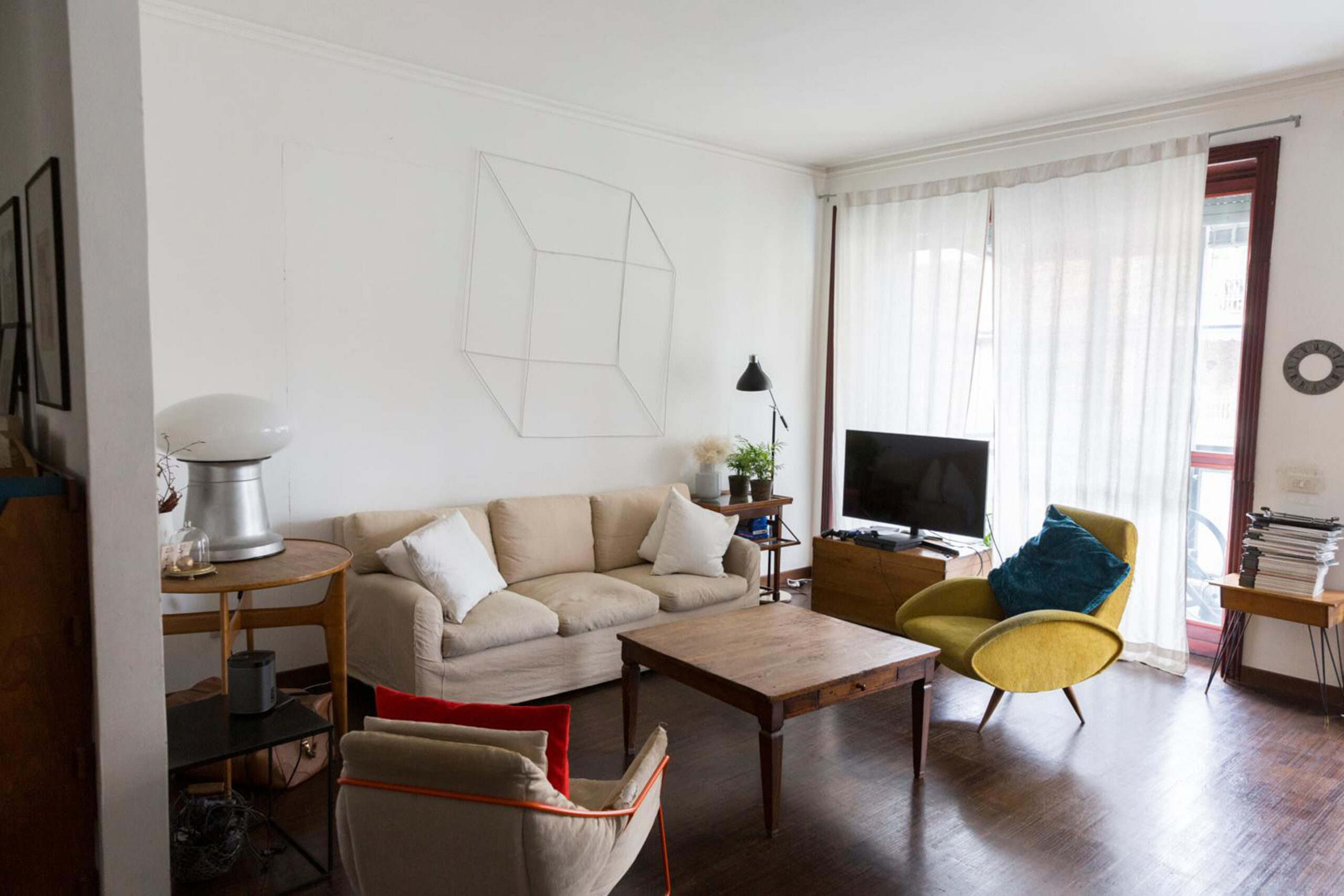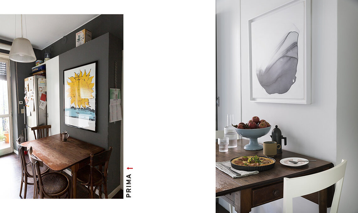 Per avere più spazio è stato eliminato il camino che era al centro della parete: non potendolo utilizzare (a Milano sono vietati quelli a focolare aperto) risultava inutilmente ingombrante.