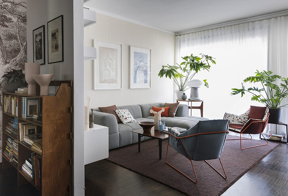 Davanti al divano, sul tappeto Poppy 700 [Kasthall, cm 200x300 € 3.200], tavolino fine Anni ’50 da [Arcarreda] come il centrotavola in legno; vasi Paleobubble [CuoreCarpenito]. Poltrone New York Armchair [Saba Italia], rivestite con tessuti Regate Nautique e Riga Contract 24 [Lelièvre da Nuance Interni Tessili]. Piantana Parliament design Le Corbusier [Nemo]; a parete, libreria modulare K1 bianca [Kriptonite] con vasi [CuoreCarpenito] e, in alto, in ceramica bronzo [Laesse].