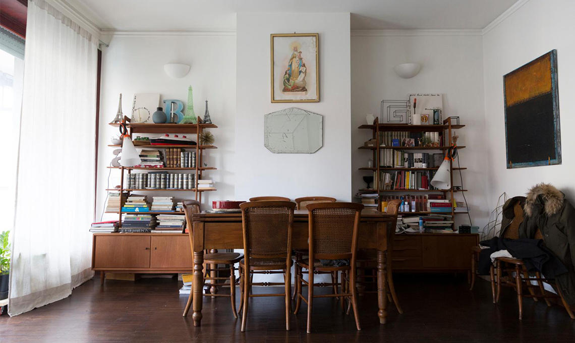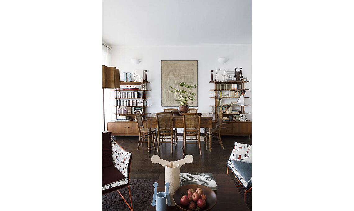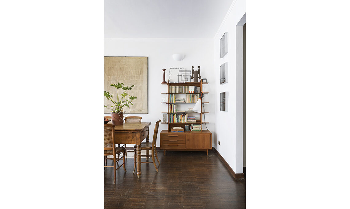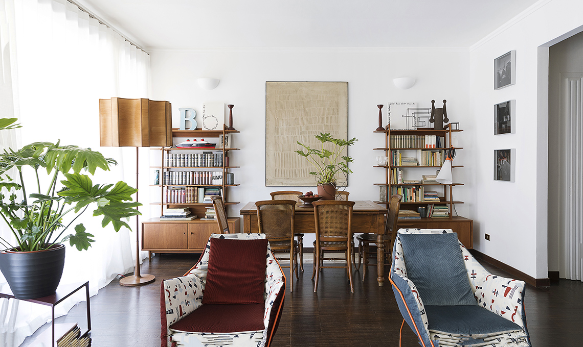Sul tavolo d’epoca, centrotavola in legno da [Arcarreda]; a parete, quadro di Arturo Vermi e, sul muro di destra, fotografie della serie Playgrounds 2007 [Linda Fregni Nagler, regalo dell’artista]. Sulle librerie vintage: tele con iniziali [Christopher Pisk] e due candelabri in legno da [Arcarreda], come la piantana vicino alla finestra; a destra, appesa, lampada Mayday [Flos € 110] e vaso [CuoreCarpenito]. piante e vasi [Viridea], tende confezionate da [I Vigna].