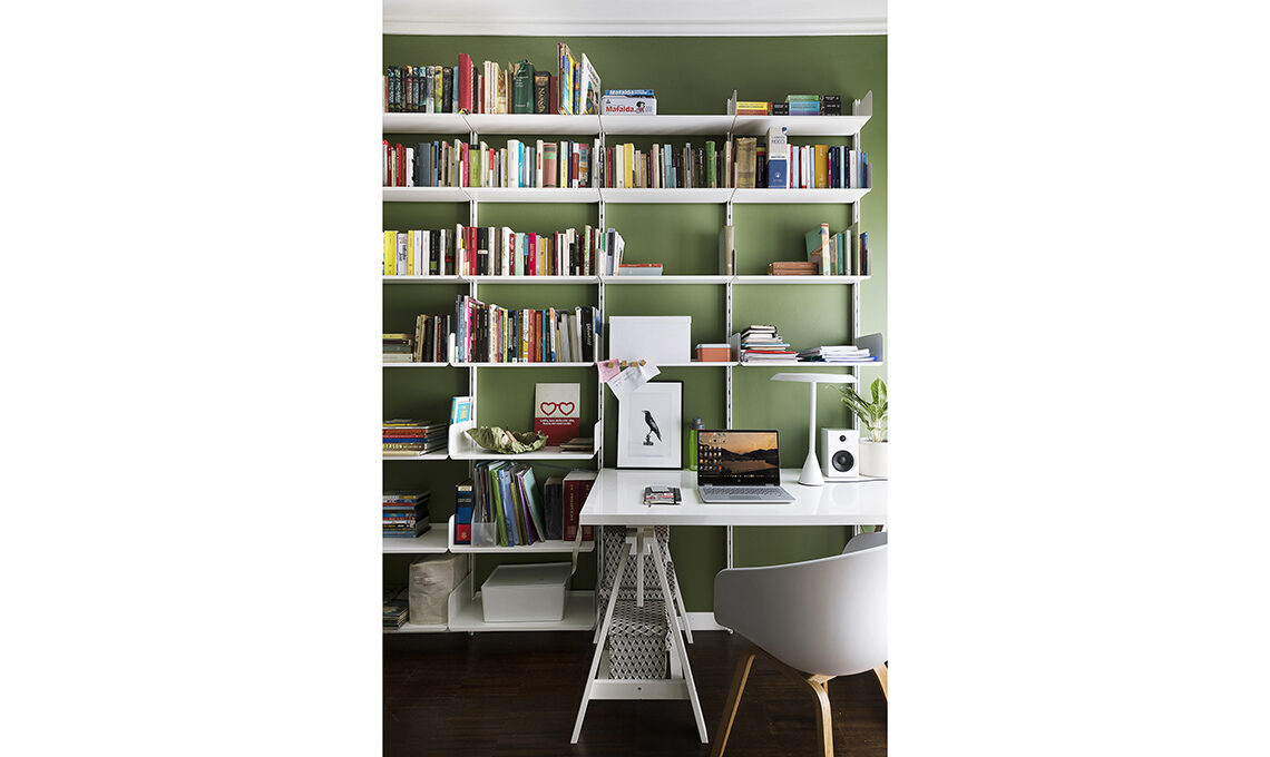 Sulla scrivania con cavalletti Lagkapten/Mittback [Ikea, cm 120x60x 75h € 69], lampada Panama [Nemo] e fotografia serie Tassidermia [Giandomenico Frassi]. Sedia About a Chair [Hay da Arcarreda] e libreria modulare bianca con montanti a terra K1 [Kriptonite], pittura murale colore H7.21.43 [Sikkens].