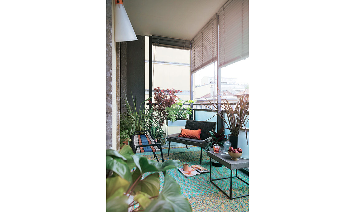 Sul tappeto Echo Green Contrast [Gervasoni], panca a due posti Adele in polipropilene riciclabile [Nodo, cm 108x36x54h], poltrona lounge Allaperto Mountain in teak decapato con seduta in Etwick Bark [Ethimo, cm 79x80x70h € 770] con cuscino Vice Versa [Christian Fischbacher]. Sul tavolino, lampada solare con manico in cuoio Milk [Ethimo €490]. Appesa, lampada Mayday [Flos € 110]. Portavasi Plantbox [Ferm Living da Design Republic, cm 60x25x65h € 199].