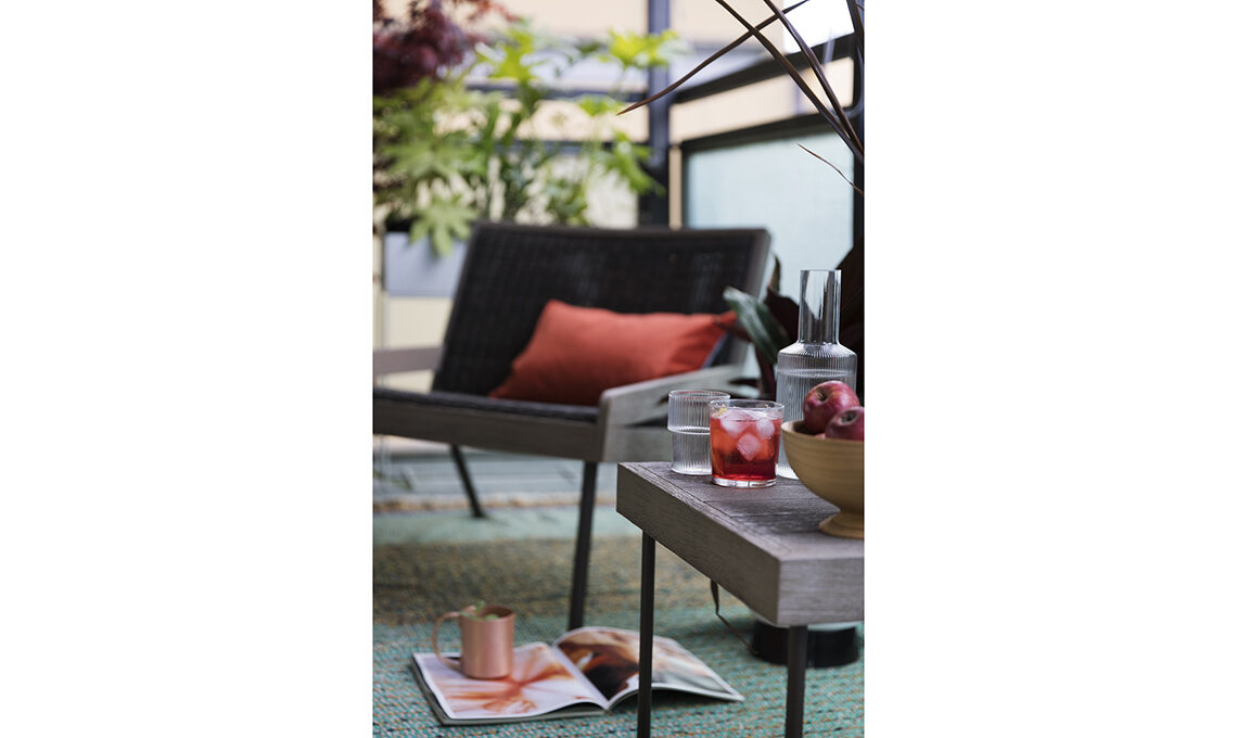 Tavolino Allaperto Urban in metallo e teak decapato [Ethimo, cm 50x50x40h € 390] con caraffa e bicchieri Ripple [Ferm Living da Design Republic], ciotola Cedar Bowl [Dovetusai €70].