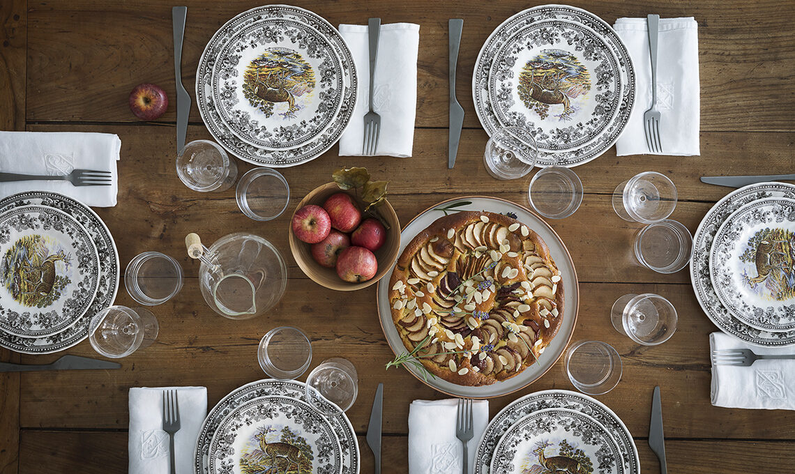 La tavola è apparecchiata con piatti dal gusto vintage Caccia [su Amazon], posate Zest Black [KnIndustrie, € 372 il set da 24], caraffa in vetro con manici in legno Tess [da € 130] di [Dovetusai] come la ciotola Cedar Bowl [ø cm 16 € 70].