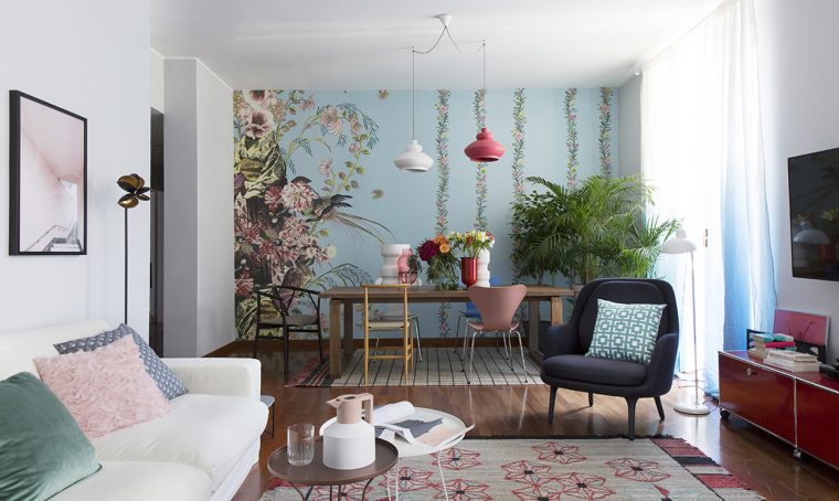 ø cm 32] e vaso rosso [Bosa], sul tavolo bicchieri Dolcevita [Guzzini] e alzata portafrutta bianca [Coincasa].