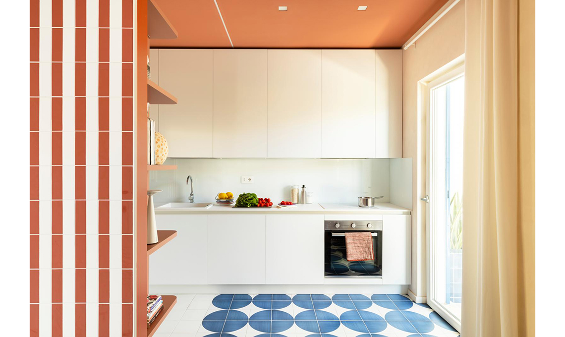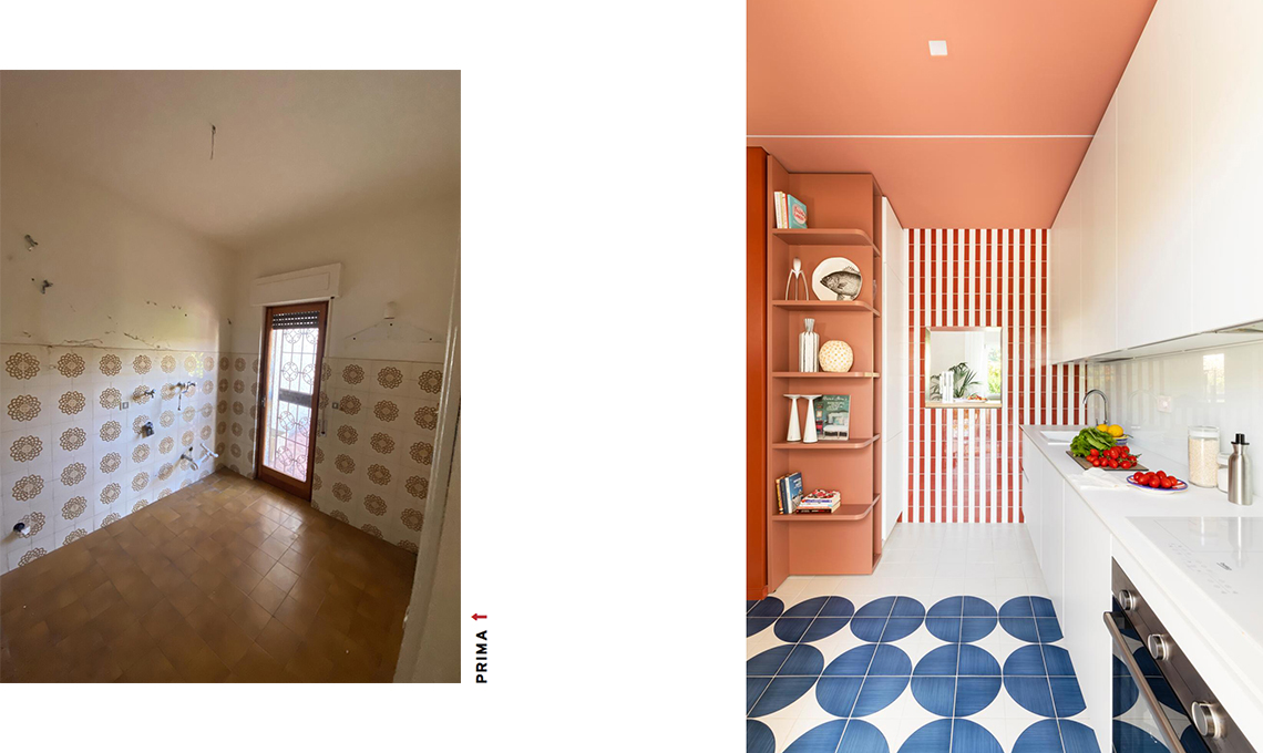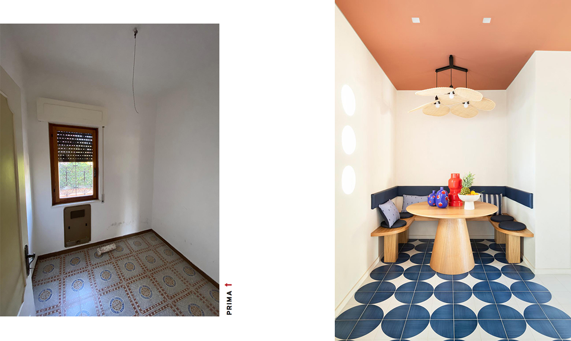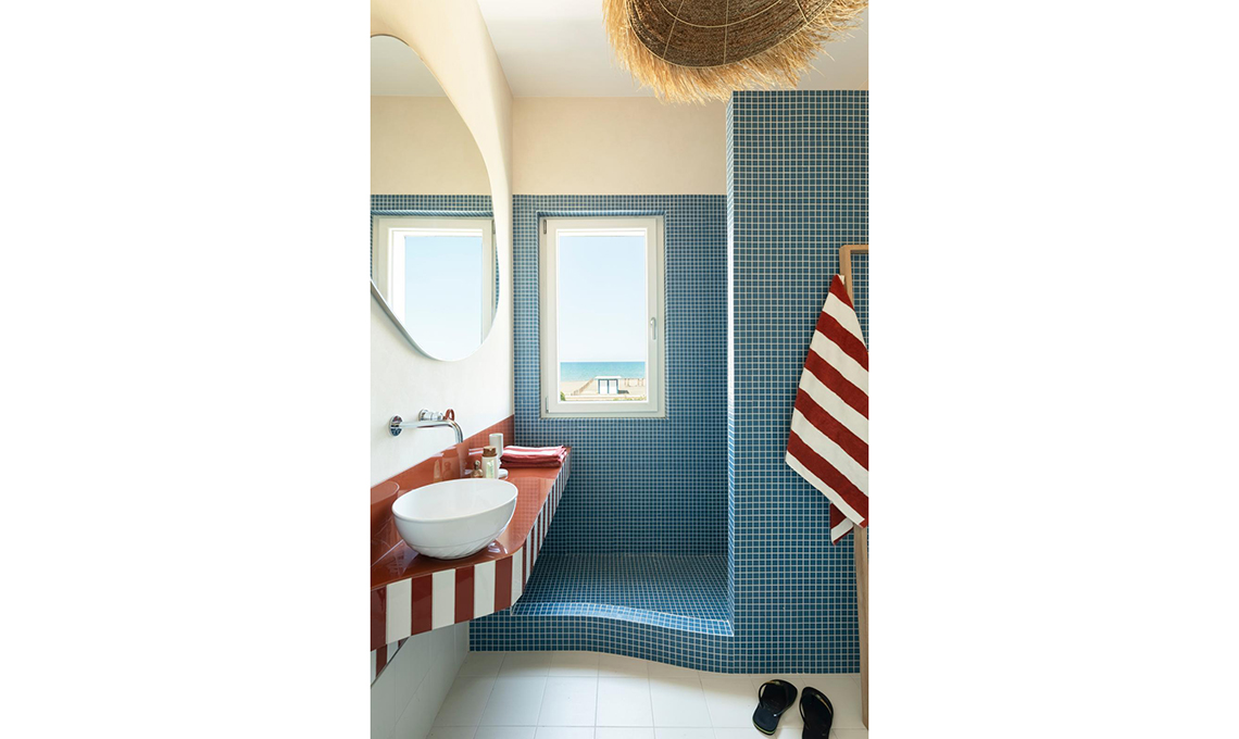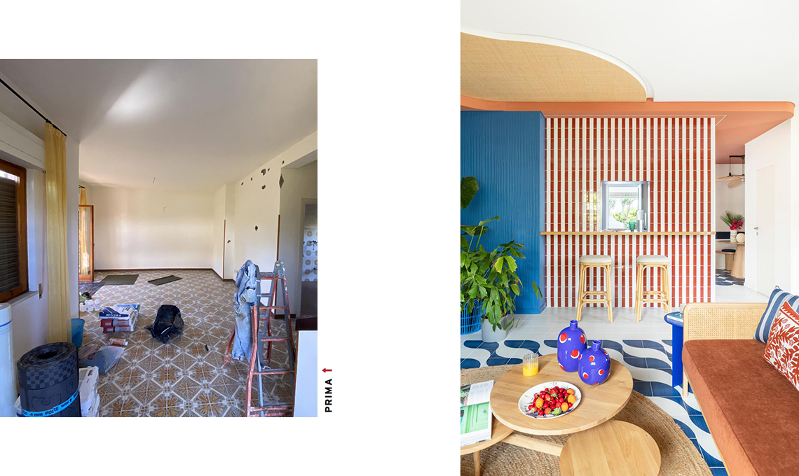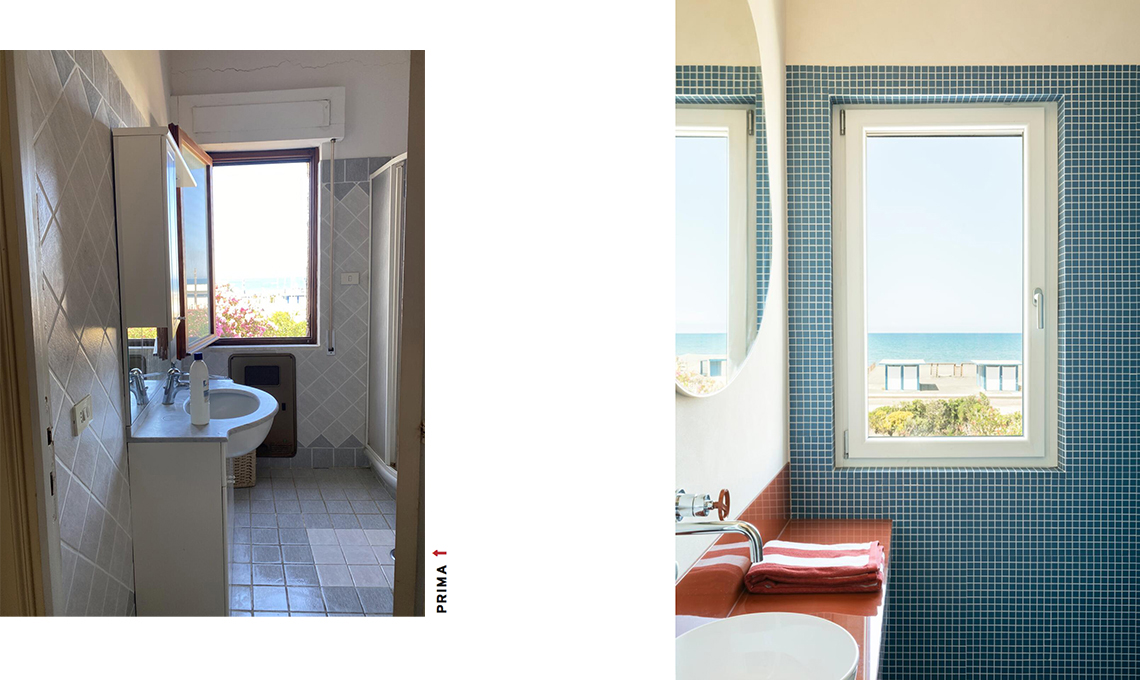 Giulia e Alessandro si conoscono proprio qui, a Tarquinia Lido e una volta sposati decidono di comprare qui la loro casa di vacanza. L’occasione è una villetta vista mare molto malandata, pane per i denti di lui che è architetto. «L’idea era quella di far rivivere gli Anni ’60 in cui è stata costruita in tutto il loro splendore, riproponendo colori e texture dei bagni del litorale laziale dell’epoca e strizzando l’occhio alle architetture di quel periodo di Gio Ponti che amo» racconta.