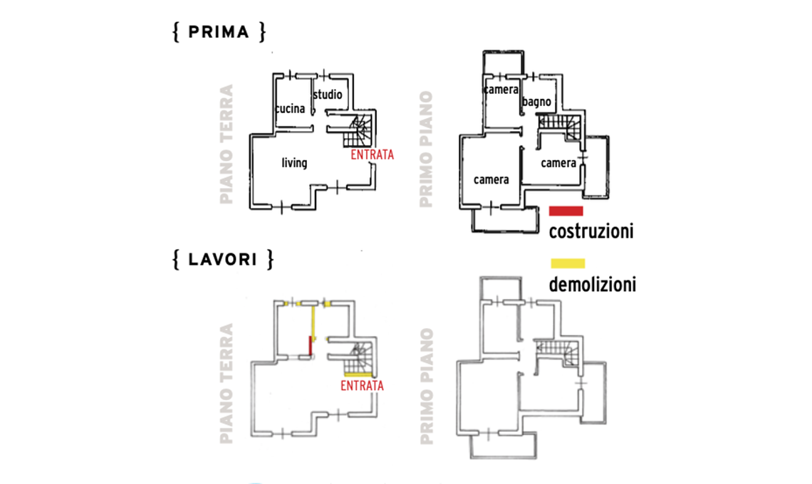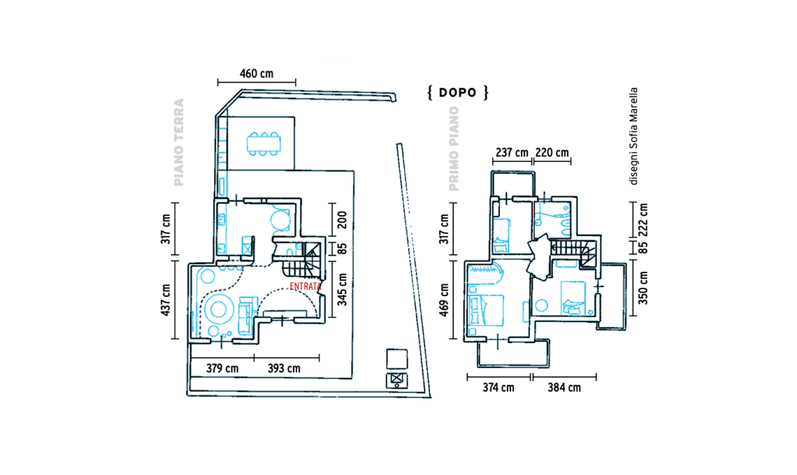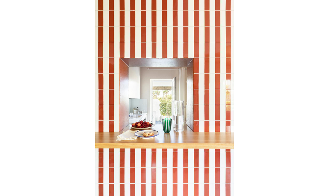 Mentre al primo piano le tre camere e il bagno sono stati ristrutturati senza modificarne le misure, al pianterreno la cucina, che ha inglobato il vecchio studio, è stata aperta sul soggiorno eliminando un tramezzo e creando un passavivande. Ridistribuiti gli spazi, grande attenzione è stata dedicata a rivestimenti e colori, che qui giocano un ruolo importantissimo. «Le ceramiche a terra disegnano tappeti e individuano le diverse zone di casa» dice Alessandro «Onde nella zona soggiorno, un tappeto blu all’ingresso, bianco nella zona servizi e infine cerchi nell’angolo pranzo». A contrasto il blocco centrale è rivestito con mattonelle rosse e bianche posate a strisce come le vecchie cabine balneari. La vera chicca è la cucina ricavata all’aperto, completa di una zona pranzo protetta da una pergola.