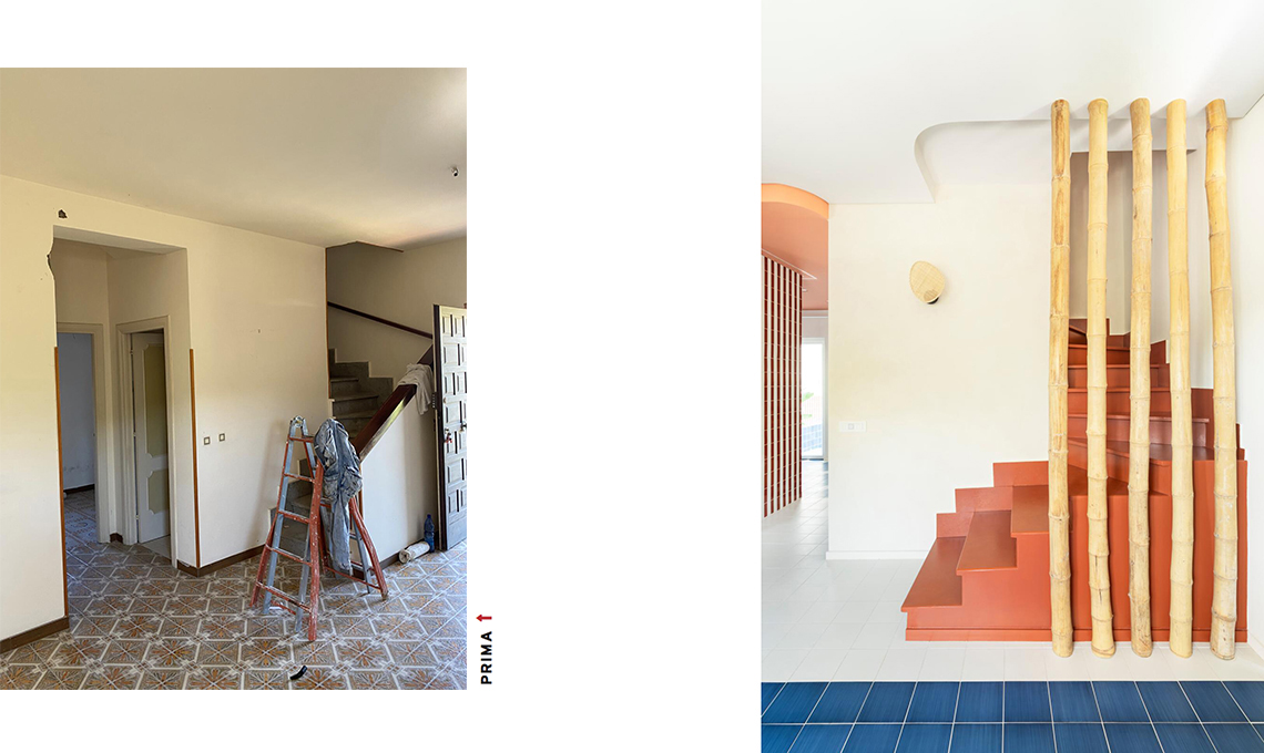 Al posto di salotto, cucina e studio separati ora c’è un open space. La scala, eliminato il parapetto in muratura, è stata rivestita in resina e schermata da tronchi in bambù.