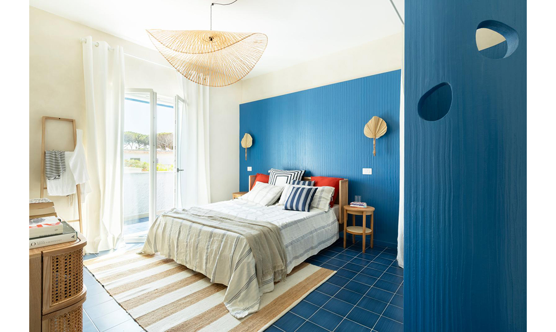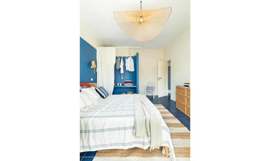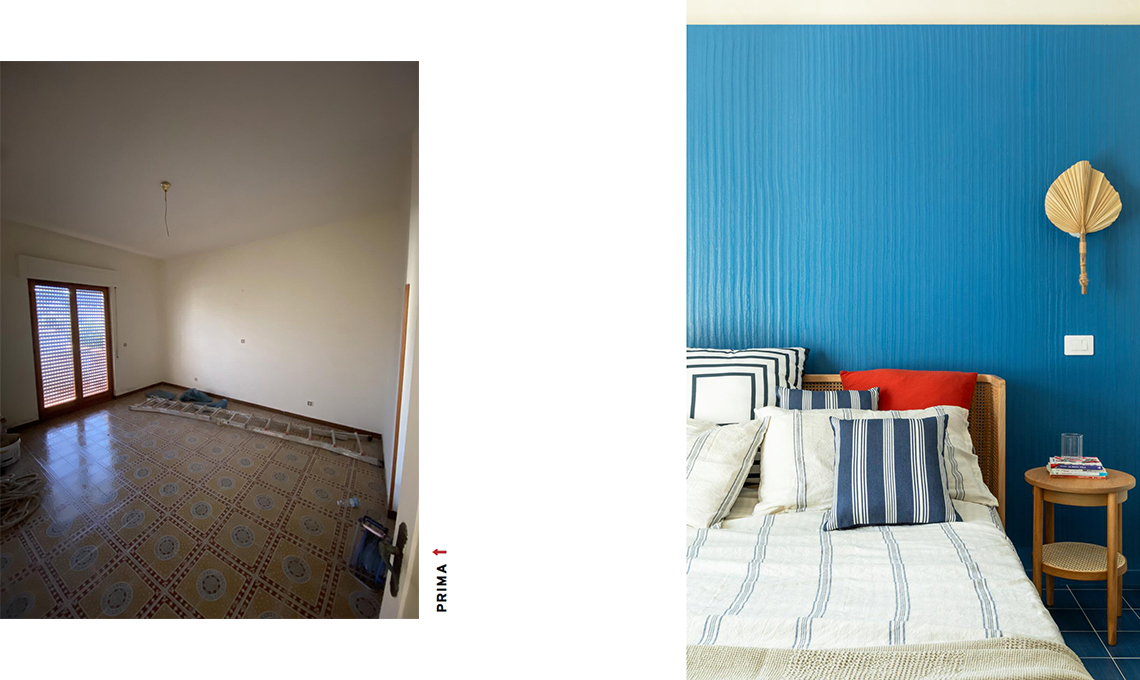 La stanza padronale con letto e armadio è stata totalmente trasformata grazie alla controparete in cartongesso rivestita in resina nello stesso blu delle piastrelle del pavimento. E Cristina ha curato i dettagli con tessili materici in nuance.