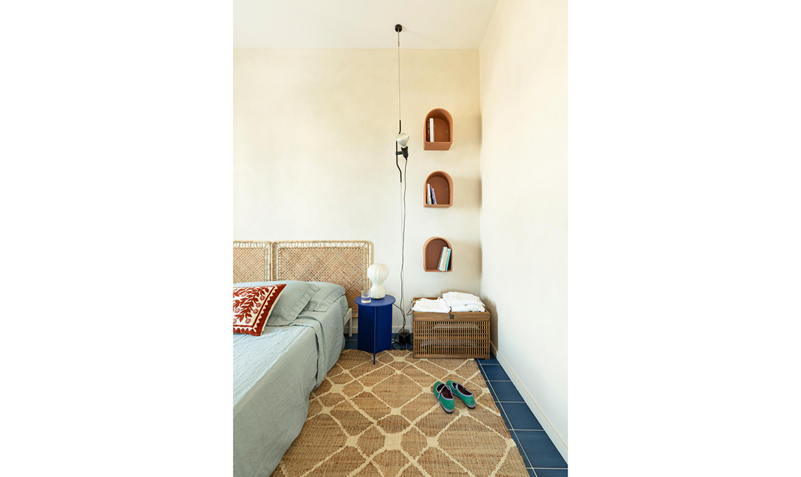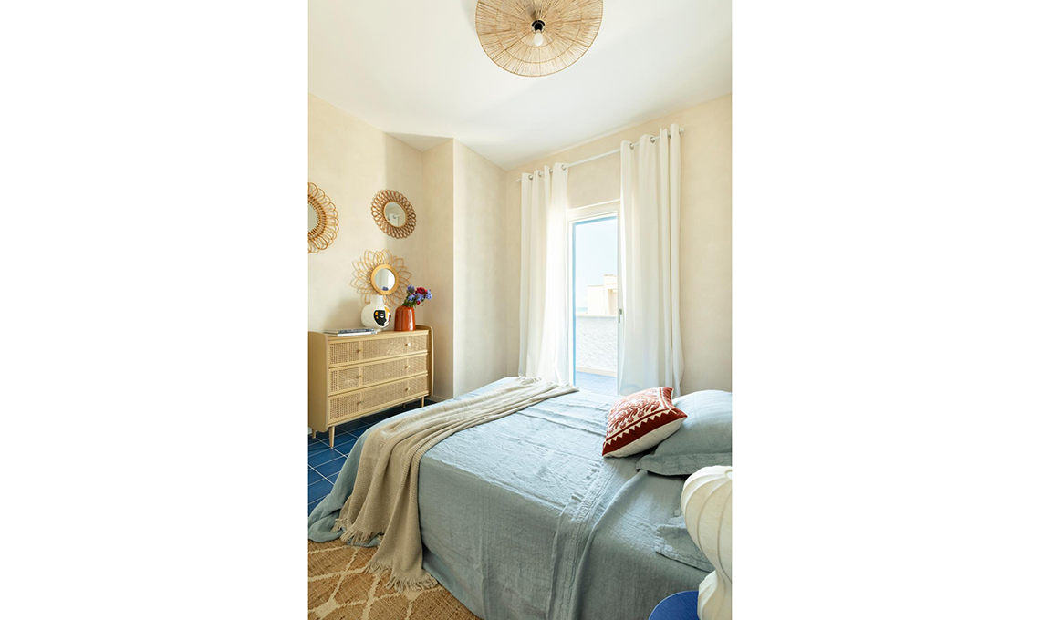 Il letto è vestito con lenzuola in lino [La Fabbrica del Lino] più plaid con frange [Fazzini] e cuscino a fiori [Élitis], cassettiera a 3 cassetti Tempa in betulla e vimini [cm 100x 7x89,5h], specchi con cornice in bambù e mensole Teracota in cemento color ruggine [cm 27x21x34h], tutto di [La Redoute], vasi di [Maisons du Monde] e tappeto in paglia [Coincasa], comodino blu in metallo Slit