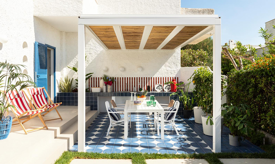 Sotto la pergola Beach Bamboo [Sprech], la tavola è apparecchiata con: tovaglia azzurra e tovaglioli bianchi [La Fabbrica del Lino], piatti multicolore realizzati a mano [Bazar Minervetta da Mia Home Design Gallery], bicchieri Laguna [Ichendorf], posate in acciaio dal mood vintage [Bitossi Home]