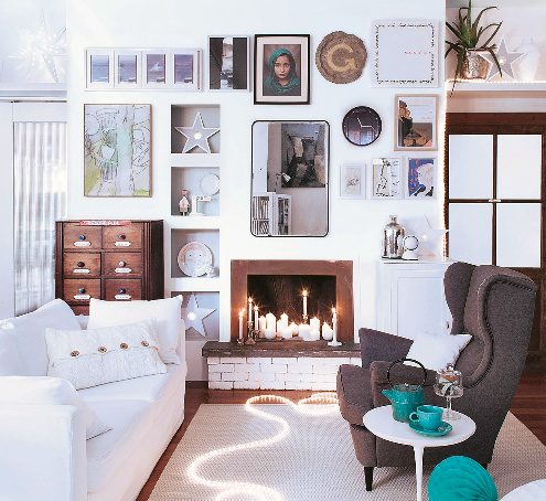 Accanto al divano Monopoli di [Désirée] come il pouf giallo, tavolino Lövbacken [Ikea, cm 77x39x51h]; a parete applique IO blu a luce direzionabile ruotando il paralume in metallo [FontanaArte, ø cm 16,5x10,5].