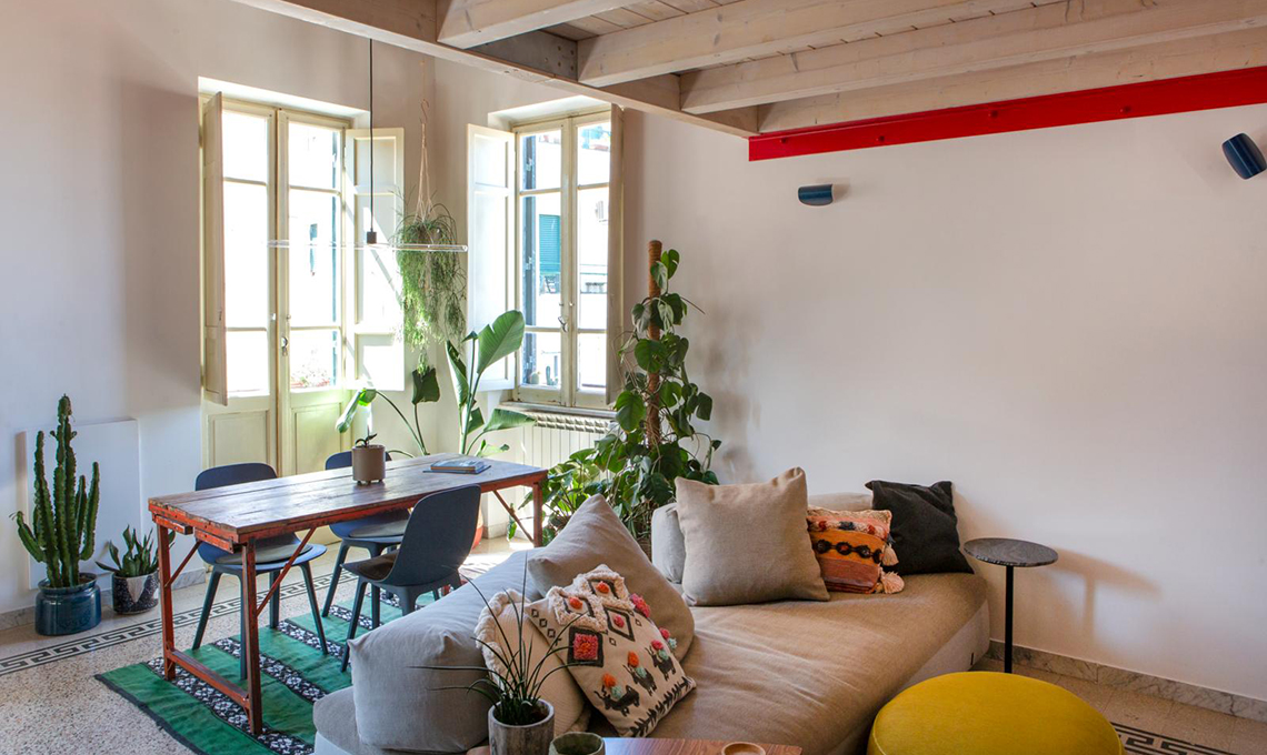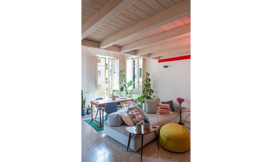 «La presenza di travi a vista e di graniglie a terra ci ha spinti a osare con il colore: alcune strutture e la scala sono in metallo tinto rosso come le gambe del tavolo da pranzo. A contrasto, gli altri arredi sono in tinte soft».
