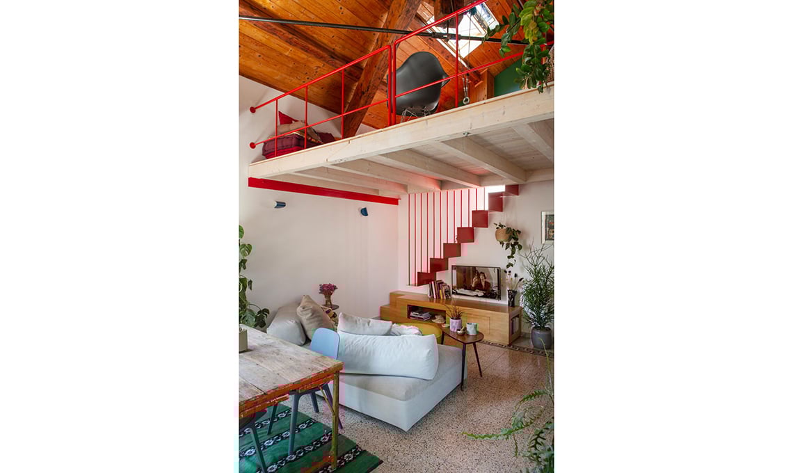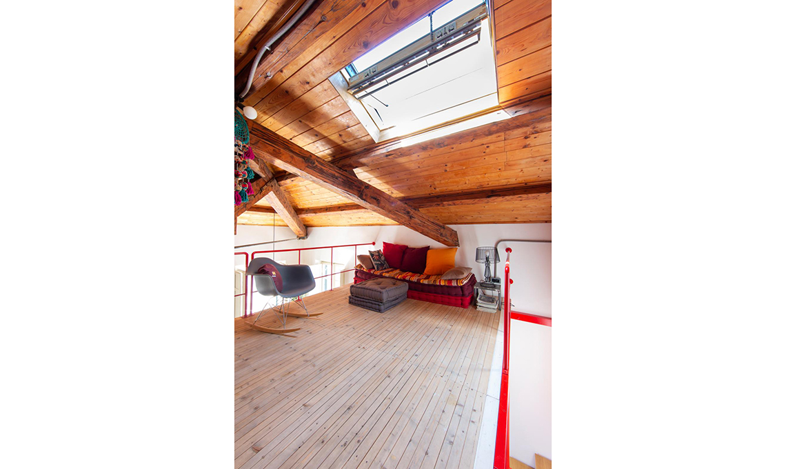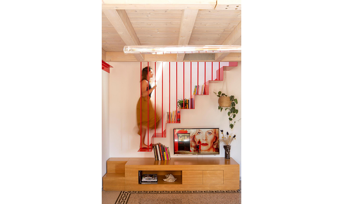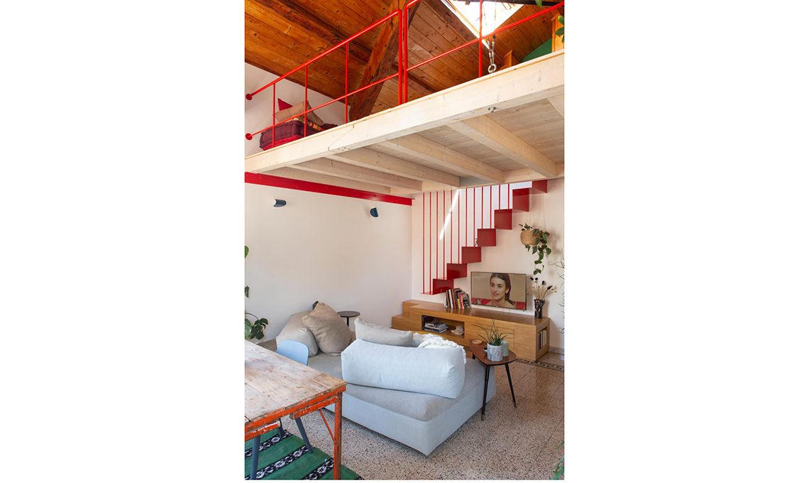 Il soppalco in legno esistente era in ottimo stato ma in una posizione poco utile. Fissando dei nuovi profili in ferro a L (poi laccati in rosso come la ringhiera) alle pareti laterali a 245 cm d’altezza, struttura e assito sono stati letteralmente traslati di 60 cm verso il centro della stanza in modo da poter inserire nel nuovo spazio libero la scala sospesa, sempre in ferro rosso e con parapetto a tondini, disegnata da Matca Studio. Ora sopra