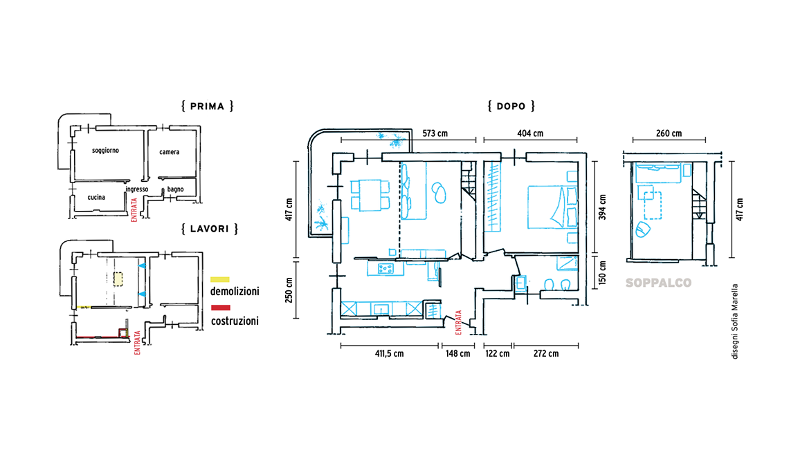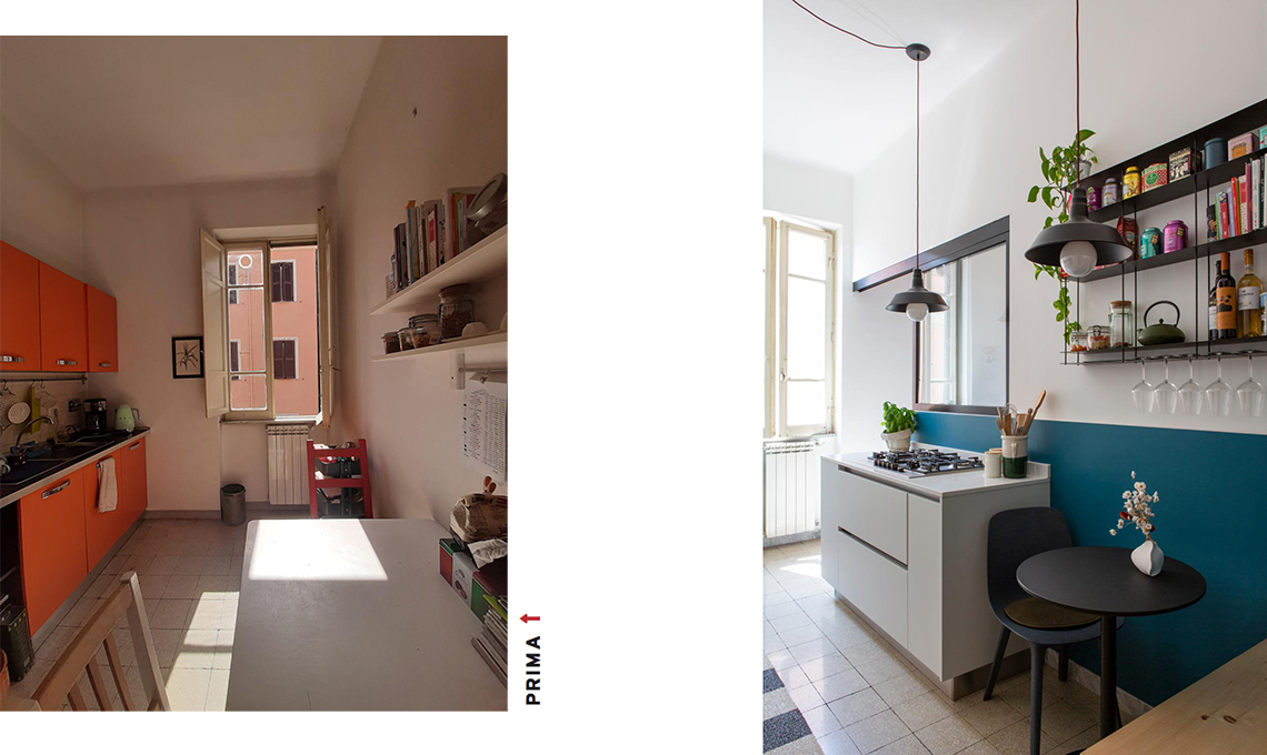 Soggiorno e cucina prima erano del tutto separati: così per portare in tavola i piatti era necessario passare dall’ingresso; in più i due locali godevano solo della luce che entrava dalle rispettive finestre. Adesso