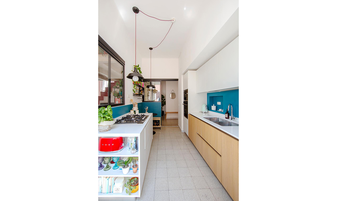 Le graniglie e le travi in legno originali sono esaltate da una palette di colori fatta da rosso, ottanio e bianco con punte di nero: tinte sempre attuali e qui perfette!
