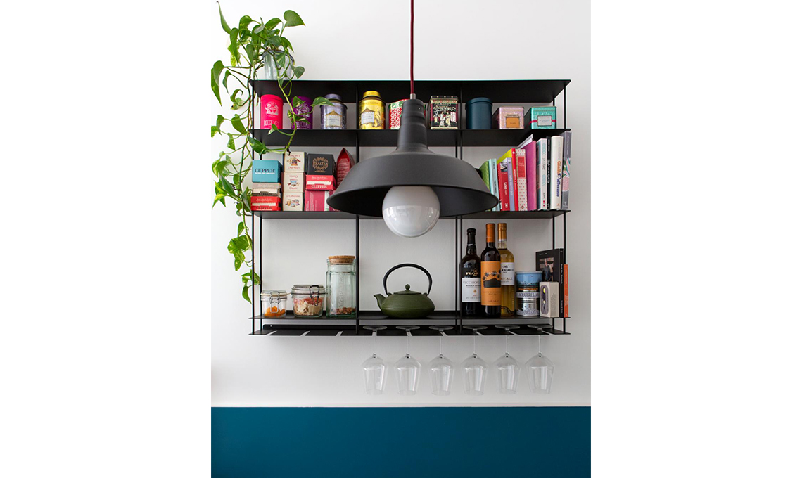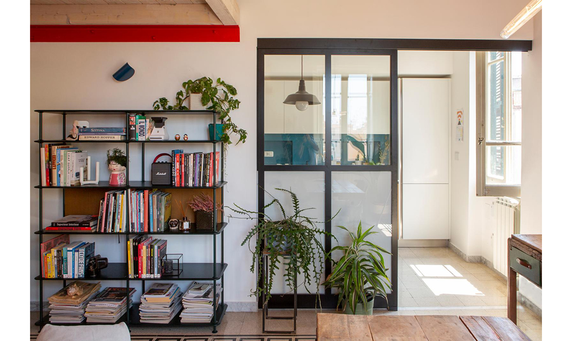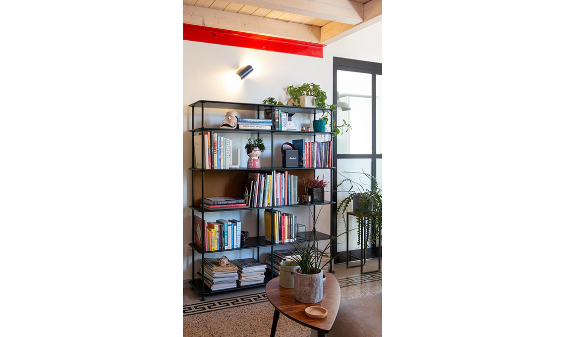 Una vecchia scaffalatura, poco capiente, si trovava sulla parete opposta rispetto a quella sulla quale ora è stata posizionata una libreria visivamente leggera con montanti in metallo e ripiani in mdf, qui in finitura Black Jade. Oltre a essere molto spaziosa, riprende nella geometria e nel colore la greca delle cementine a pavimento e il disegno di parete e porta in ferro e vetro che dividono il living dalla cucina: anche questo accordo aiuta a creare una sensazione di ordine nell’ambiente.