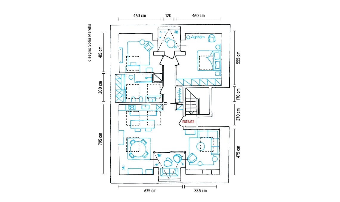 Prima di tutto è stato realizzato un nuovo tetto autoportante, cioè formato da una rete di travi e travetti in legno incastrati fra loro in modo che scarichino i pesi sulla parte perimetrale in muratura e non siano necessari pilastri interni: «Questo ci ha permesso di avere un living aperto in cui cucina, pranzo e salotto sono ben definiti ma in continua connessione» spiega Beatrice. E per dare più luce possibile sono state aperte 8 finestre in falda in aggiunta ai due terrazzini a patio al centro dei lati minori. Dal lato opposto, la zona notte e il bagno sono molto intimi e si affacciano sul corridoio armadiato dall’effetto scatola.