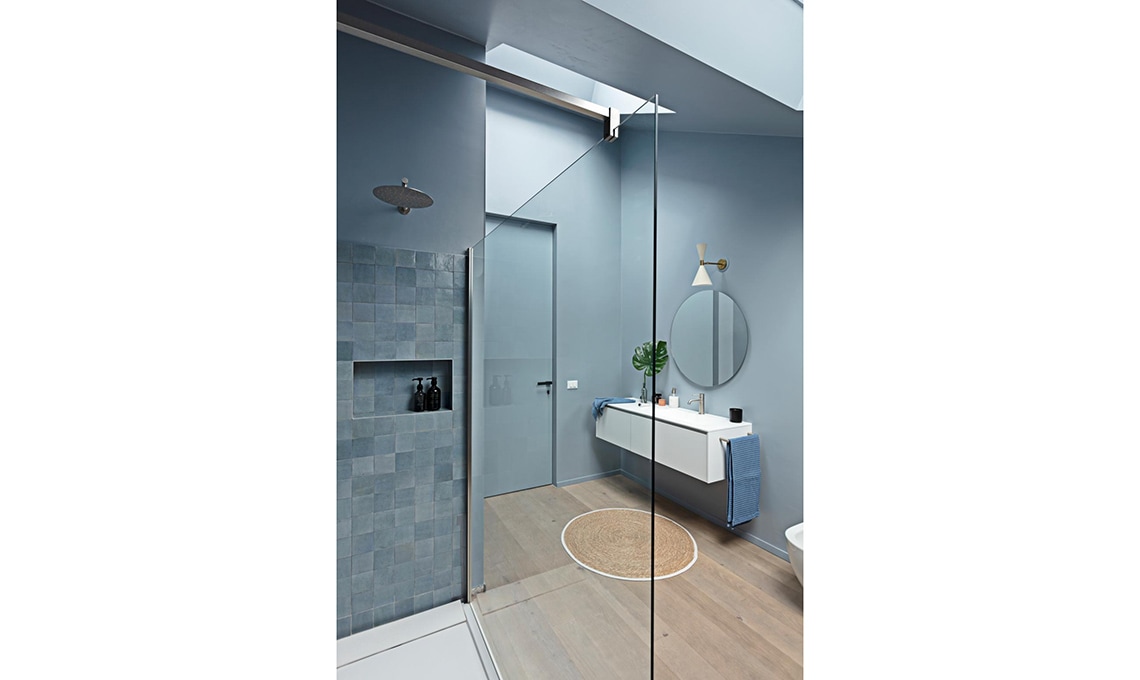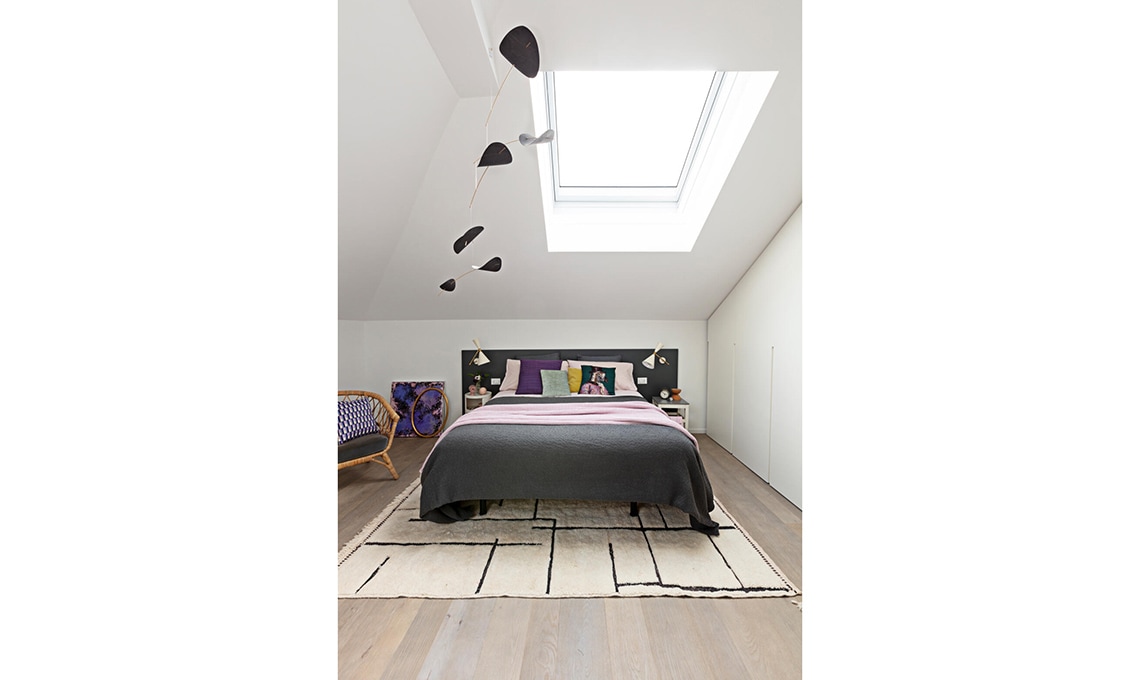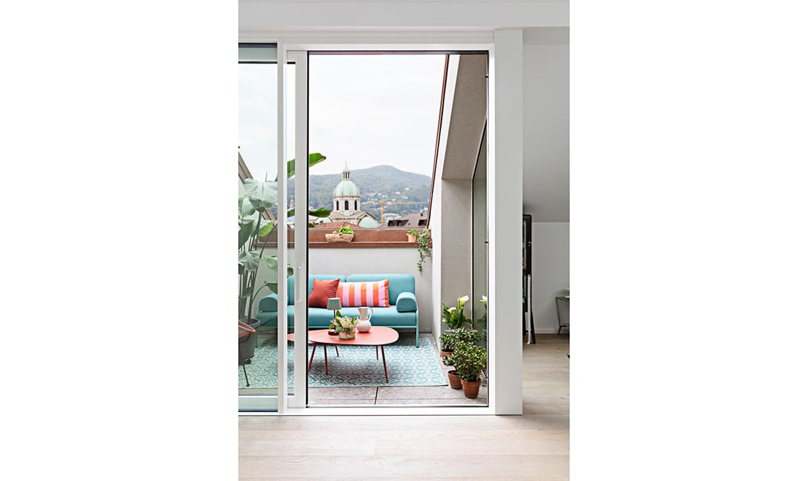 Non solo tessuti: dal pavimento chiaro spazzolato agli accessori, le superfici vibrano, colpite dalla luce che entra dalle finestre sul tetto. Il terrazzo a tasca è finestrato su 3 lati: due sono vetri fissi e solo quello centrale si apre con un’anta scorrevole. Le finestre da tetto della casa sono il modello a bilico con vetro stratificato GGU Integra elettrica ad alimentazione solare, grazie a una cella fotovoltaica posta all’esterno (così non servono allacci alla rete elettrica) che si può azionare con telecomando (o tramite smartphone); in caso di pioggia, si chiudono da sole grazie al sensore di cui sono dotate [Velux, da cm 55x78]. Qui hanno tende parasole esterne [Velux, da cm 55x 78].