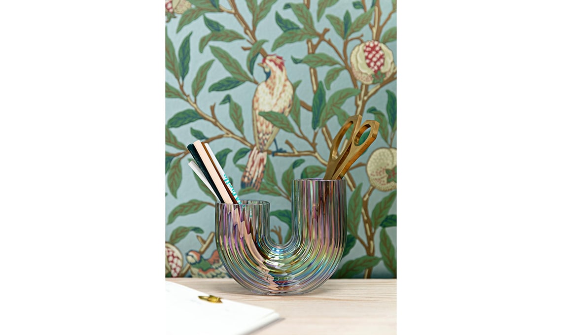 Libreria a totem Sixty amaranto [Rimadesio] con vaso rosso Denno [Jysk], box in terracotta bianca [Maisons du Monde], scatola Tjena [Ikea]. Carta da parati Bird & Pomegranate [Morris&co su etoffe.com]. Sullo scaffale Maine [Casa, cm 120x38x100h], lampada Arnold [Jysk], stampa incorniciata Fine Art di Cristina Piccoli [Galleria L’Affiche, cm 25x25], vasi [Raawaii, Ikea e Serax], a terra stampa incorniciata Fine Art di Francesca Zoboli [Galleria L’Affiche, cm 49,5x33]. Sullo scrittoio: stampa incorniciata Fine Art di Cristina Piccioli [Galleria L’Affiche, cm 30x30], lampada Hektar, di [Ikea], agenda [Ella’s Notes]. Sulla sedia, cuscino Mazan [Maisons du Monde]. Sacco Le sac en papier [A.S.L. by studio Saint-Lazare], sgabello vintage verde acqua [Talea Como]. tappeto [Casa Amar].