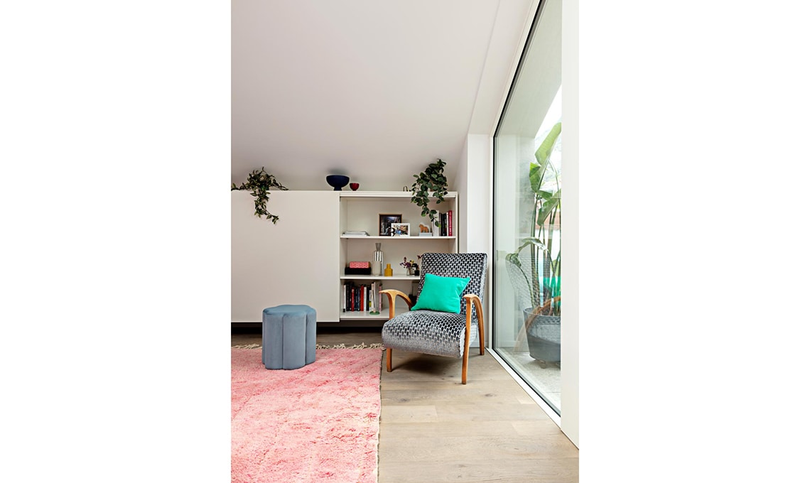 Parquet con finitura spazzolata [Mardegan]. poltroncina vintage con cuscino con fodera Canoas [Maisons du Monde cm 40x40], tappeto artigianale marocchino Beni Ourain rosa [Casa Amar, cm 270x180]. Infissi del terrazzino [Schüco Italia].