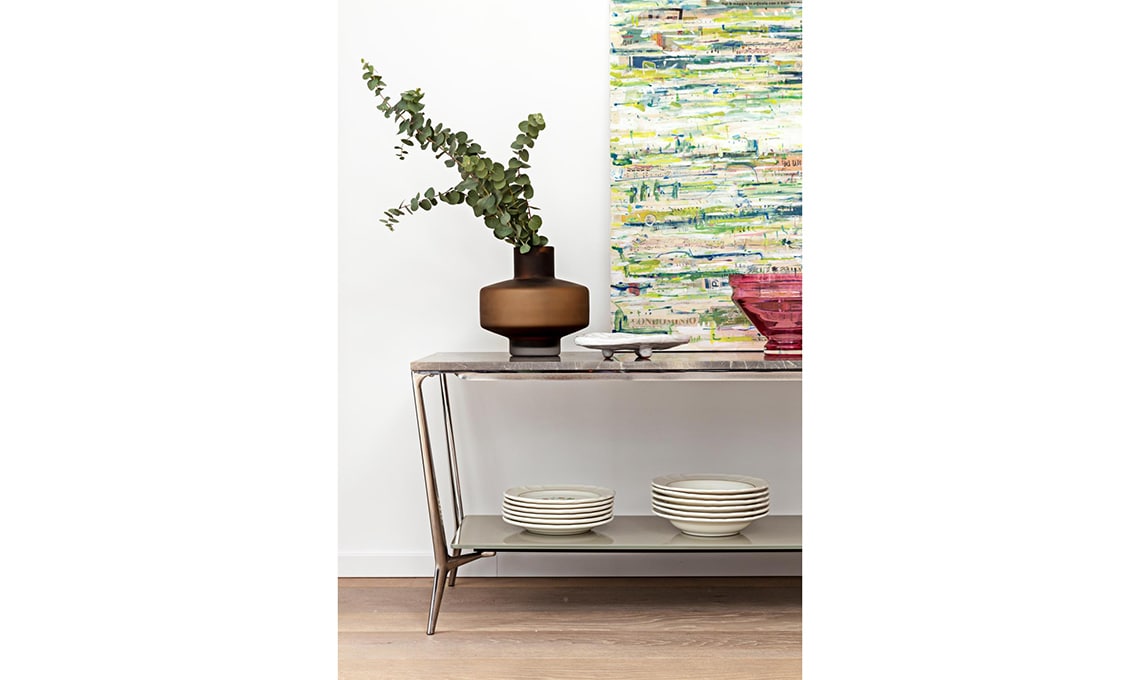 «Adoro il grigio piombo che ho usato per i mobili (con tutta la luce che c’è qui, gli ambienti non si incupiscono) e il contrasto fra minimal e raw» dice Beatrice. «Con l’aiuto di Simona Ortolan abbiamo dato verve con tessili dai colori accesi e tappeti dalla texture importante».