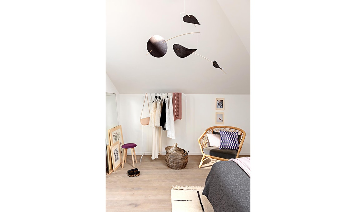 Sullo stender Mulig [Ikea], abiti e accessori [Deposito80] come lo specchio vintage, cesta Leo [Casa]; mobile Flensted Drifting Clouds [Ole Flensted], sulla poltrona [Ikea] cuscino [Maisons du Monde].