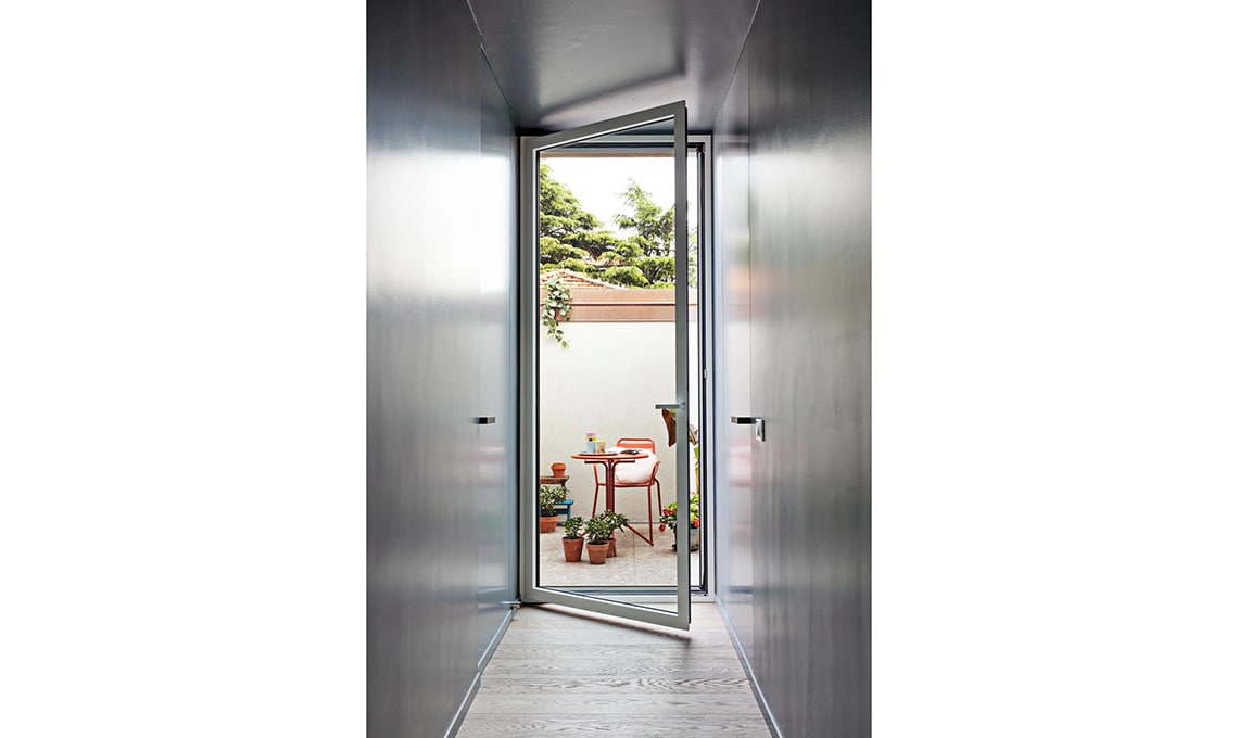 Portafinestra [Schüco Italia], smalto French Mood [Fleur Paint], tavolo Olav e sedia Liva [Casa] con cuscino [Søstrene Grene], vassoio e bicchieri [Lalaland], sgabelli e piante [Talea Como].