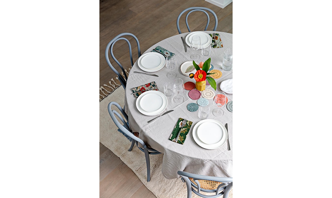 Tovaglia in lino [Zara Home], piatti [Casa], posate [Lagostina], bicchieri acqua [Ichendorf] e vino [Riedel], centrini vintage in cotone colorato, vaso Lourmarin ocra [Maisons du Monde], piatti in ceramica con foglie dipinte a mano [Fragile Studio, ø cm 18], tovaglioli sartoriali Morris in cotone [Milou Milano, cm 40x40].