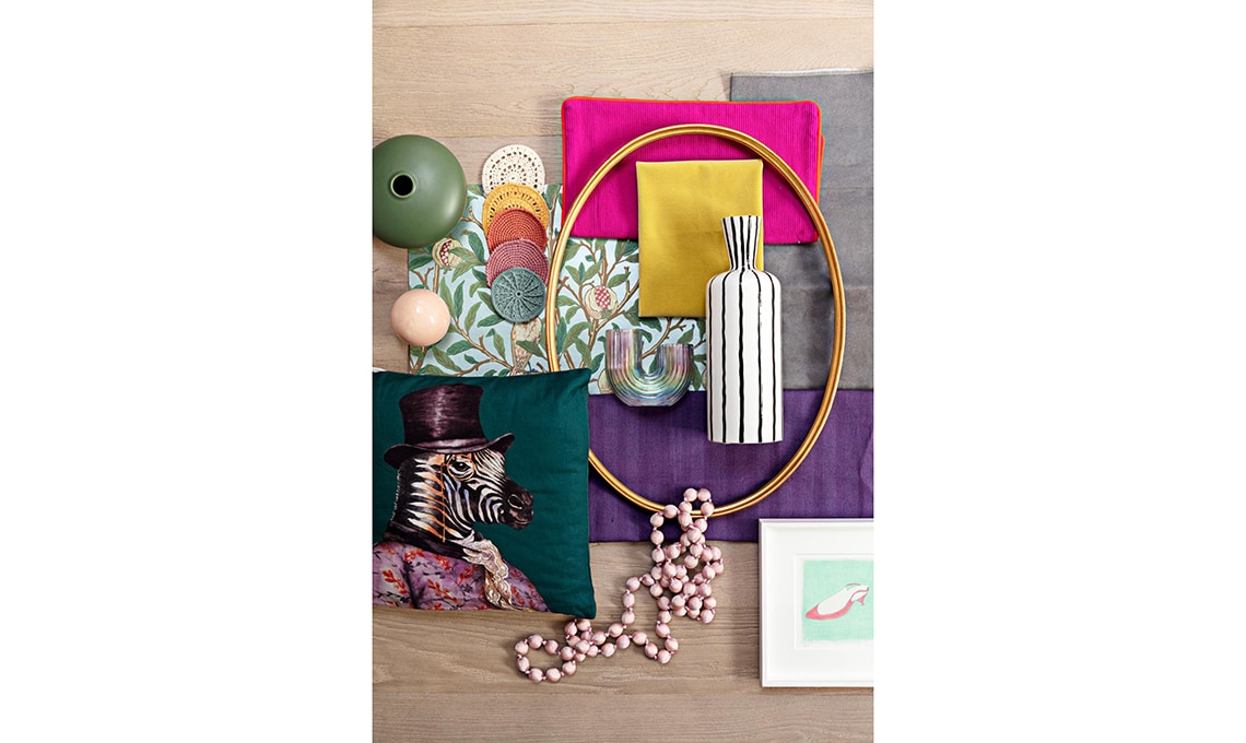 Sul mobile vintage, lettera B, vaso in vetro, ex voto e specchi [Deposito 80], luce da terra [Eluce], cesta in metallo [Talea Como] con plaid Neo con pompon fucsia [cm 130x170] di [Maisons du Monde] come il cuscino con fodera Mazan fucsia [cm 40x40] sul divano [Artigiansalotti] con il cuscino in velluto a righe [Rice su myghomeline.com, cm 80x40 € 59]; sul tavolino Nurio, in acciaio [Casa, ø cm 70x40h], vaso e ciotola [Raawii] come il tavolino in metallo nero Thing by George Sowden [Raawaii, ø cm 28x40h], con candele e portacandele [Jysk].