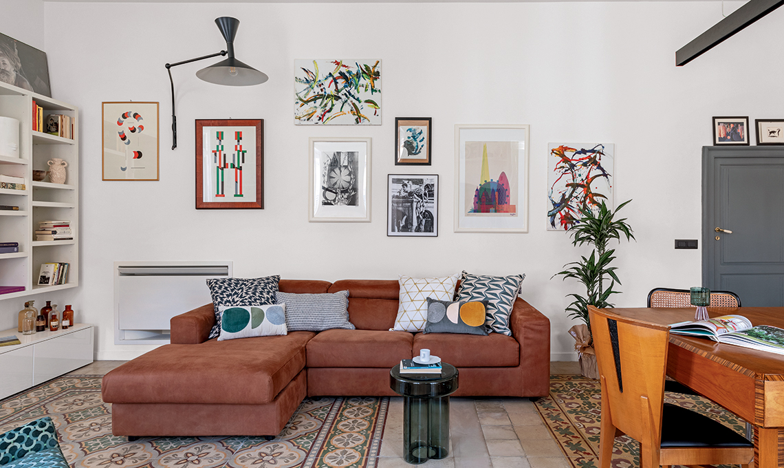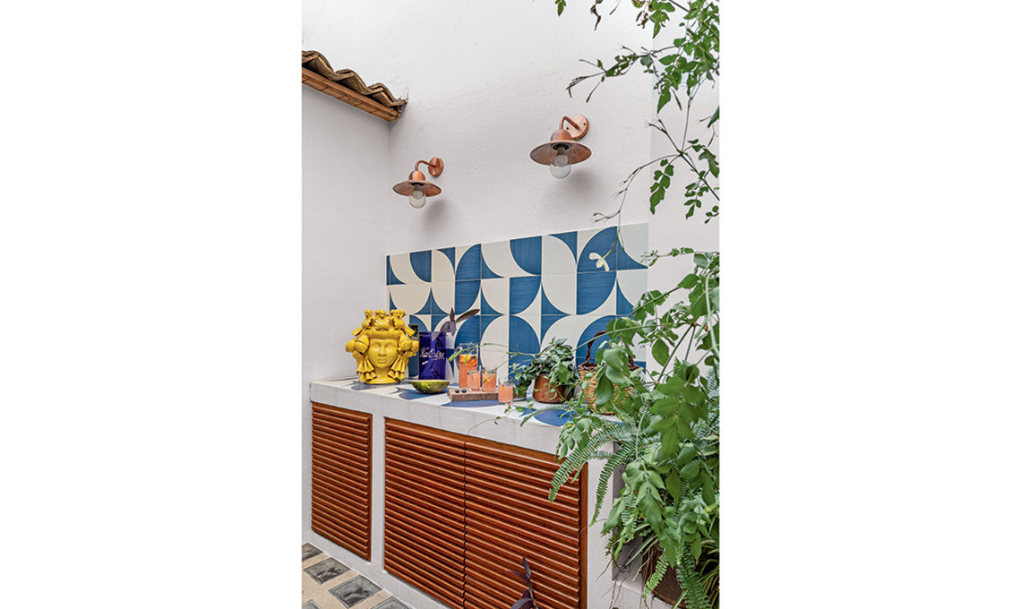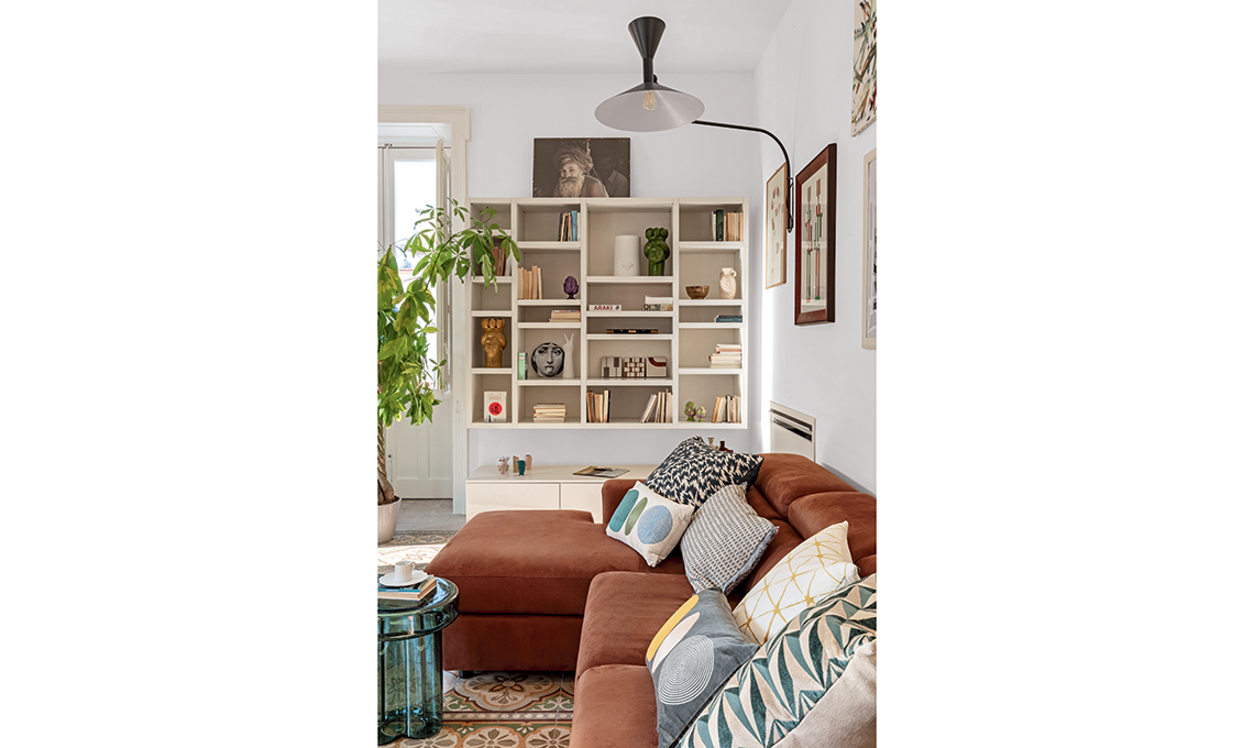 Lampada a braccio Lampe de Marseille [Nemo Lighting] e tavolino Soda [Miniforms da Russo&DiMauro], tazzina [Alessi]; cuscini [Kirkby Design] e [Villa Nova], quelli con i cerchi Nazca [Fazzini]. Nella libreria, teste di moro Solimano e Roxelana d’India [Crita Ceramiche], piastrelle di ceramica di Caltagirone