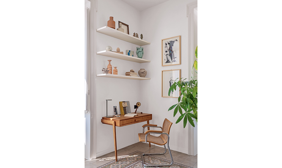 Scrivania console Colas [La Redoute], lampada Oblique [Flos], orologio da tavolo Mini Puntero [Nomon da Russo&DiMauro], vasi delle coll. Marmi, Terra e Augusto [Federica Bubani], testa di moro pop [Folk Magda Masano]. Quadri di Innocenzo Carbone.
